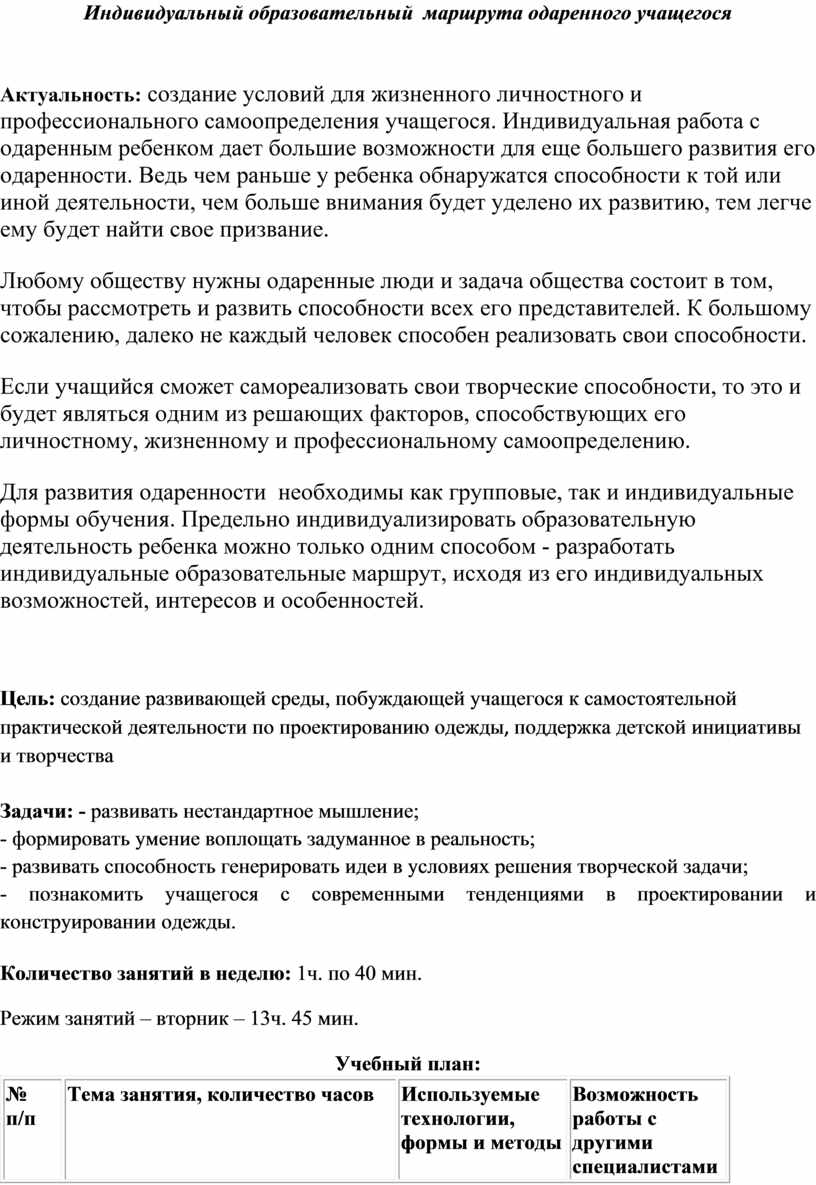 Для развития одаренности необходимы как групповые, так и индивидуальные формы обучения. Предельно индивидуализировать образовательную деятельность ребенка можно только одним способом - разработать индивидуальные образовательные маршрут, исходя из его индивидуальных возможностей, интересов и особенностей.