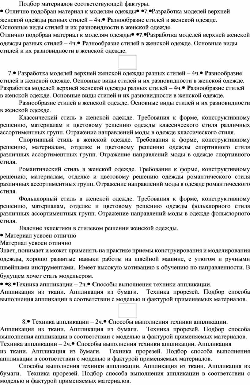 Материал усвоен отлично Знает, понимает и может применять на практике приемы конструирования и моделирования одежды, хорошо развитые навыки работы на швейной машине, с утюгом и ручными швейными инструментами. Имеет высокую мотивацию к обучению по направленности. В будущем хочет стать модельером.