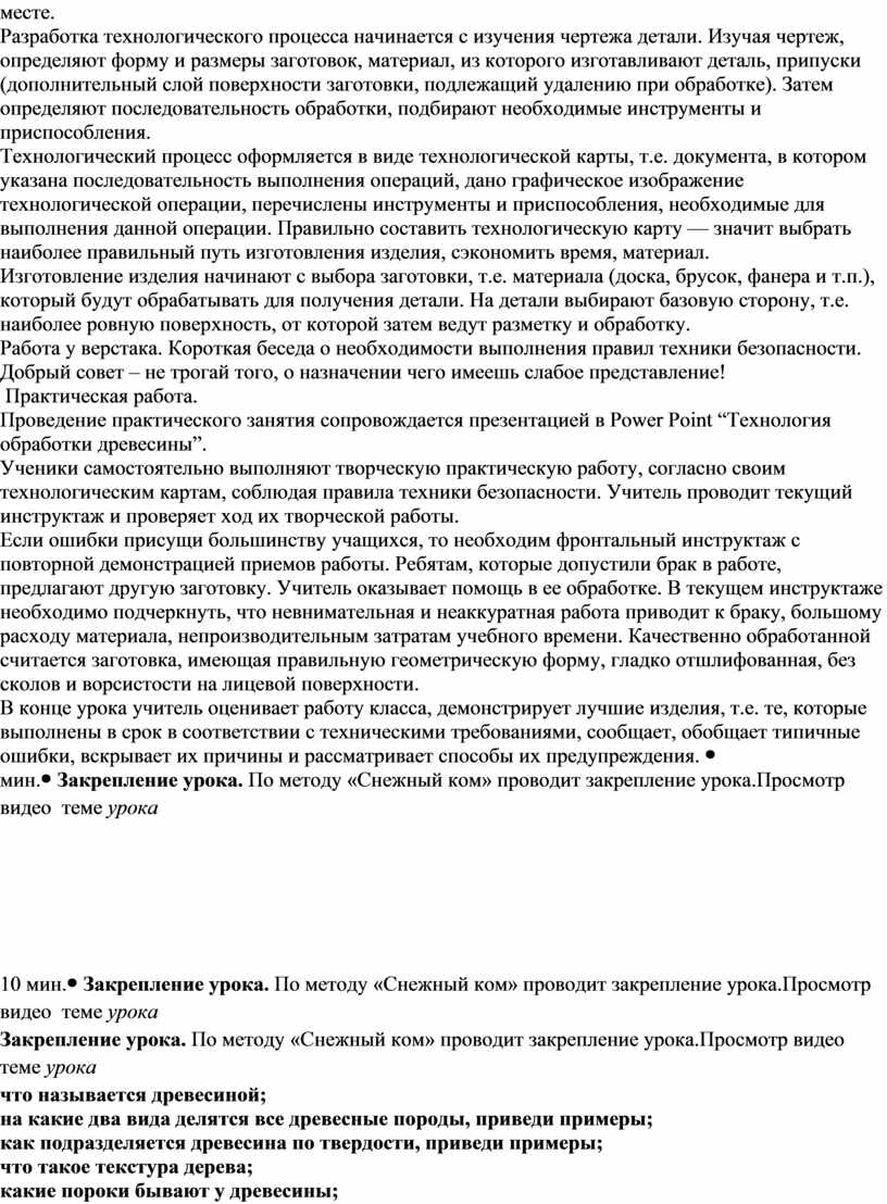 II. Закрепление урока. По методу «Снежный ком» проводит закрепление урока.Просмотр видео теме урока что называется древесиной; на какие два вида делятся все древесные породы, приведи примеры; как подразделяется древесина по твердости, приведи примеры; что такое текстура дерева; какие пороки бывают у древесины; разметочный инструмент, инструмент для пиления. |