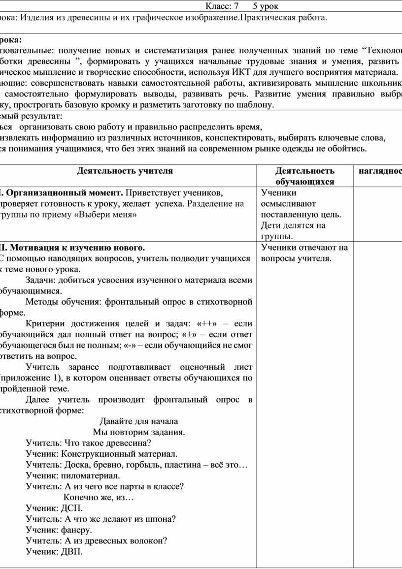 II. Мотивация к изучению нового. С помощью наводящих вопросов, учитель подводит учащихся к теме нового урока. Задачи: добиться усвоения изученного материала всеми обучающимися. Методы обучения: фронтальный опрос в стихотворной форме. Критерии достижения целей и задач: «++» – если обучающийся дал полный ответ на вопрос; «+» – если ответ обучающегося был не полным; «-» – если обучающийся не смог ответить на вопрос. Учитель заранее подготавливает оценочный лист (приложение 1), в котором оценивает ответы обучающихся по пройденной теме. Далее учитель производит фронтальный опрос в стихотворной форме: Давайте для начала Мы повторим задания. Учитель: Что такое древесина? Ученик: Конструкционный материал. Учитель: Доска, бревно, горбыль, пластина – всё это… Ученик: пиломатериал. Учитель: А из чего все парты в классе? Конечно же, из… Ученик: ДСП. Учитель: А что же делают из шпона? Ученик: фанеру. Учитель: А из древесных волокон? Ученик: ДВП.