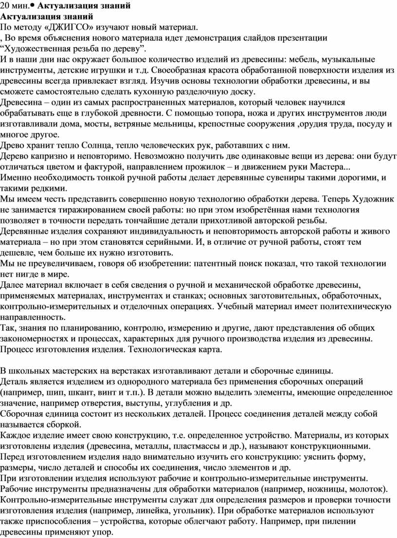 I. Актуализация знаний По методу «ДЖИГСО» изучают новый материал. , Во время объяснения нового материала идет демонстрация слайдов презентации “Художественная резьба по дереву”. И в наши дни нас окружает большое количество изделий из древесины: мебель, музыкальные инструменты, детские игрушки и т.д. Своеобразная красота обработанной поверхности изделия из древесины всегда привлекает взгляд. Изучив основы технологии обработки древесины, и вы сможете самостоятельно сделать кухонную разделочную доску. Древесина – один из самых распространенных материалов, который человек научился обрабатывать еще в глубокой древности. С помощью топора, ножа и других инструментов люди изготавливали дома, мосты, ветряные мельницы, крепостные сооружения ,орудия труда, посуду и многое другое. Древо хранит тепло Солнца, тепло человеческих рук, работавших с ним. Дерево капризно и неповторимо. Невозможно получить две одинаковые вещи из дерева: они будут отличаться цветом и фактурой, направлением прожилок – и движением руки Мастера... Именно необходимость тонкой ручной работы делает деревянные сувениры такими дорогими, и такими редкими. Мы имеем честь представить совершенно новую технологию обработки дерева. Теперь Художник не занимается тиражированием своей работы: но при этом изобретённая нами технология позволяет в точности передать тончайшие детали прихотливой авторской резьбы. Деревянные изделия сохраняют индивидуальность и неповторимость авторской работы и живого материала – но при этом становятся серийными. И, в отличие от ручной работы, стоят тем дешевле, чем больше их нужно изготовить. Мы не преувеличиваем, говоря об изобретении: патентный поиск показал, что такой технологии нет нигде в мире. Далее материал включает в себя сведения о ручной и механической обработке древесины, применяемых материалах, инструментах и станках; основных заготовительных, обработочных, контрольно-измерительных и отделочных операциях. Учебный материал имеет политехническую направленность. Так, знания по планированию, контролю, измерению и другие, дают представления об общих закономерностях и процессах, характерных для ручного производства изделия из древесины. Процесс изготовления изделия. Технологическая карта.