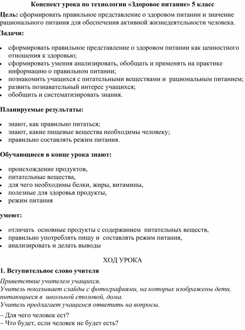 Конспект урока по технологии «Здоровое питание» 5 класс
