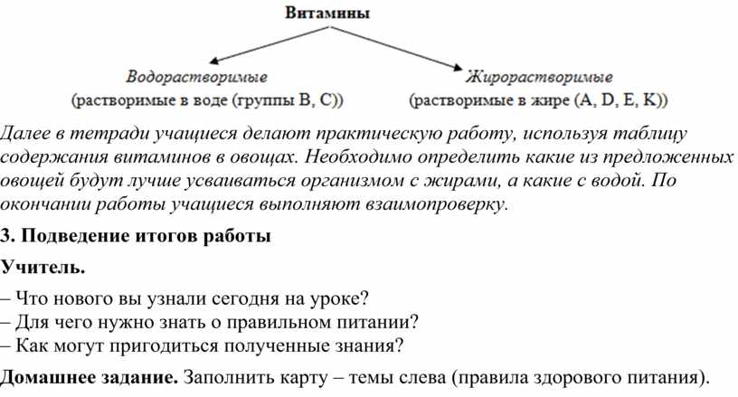 Далее в тетради учащиеся делают практическую работу, используя таблицу содержания витаминов в овощах. Необходимо определить какие из предложенных овощей будут лучше усваиваться организмом с жирами, а какие с водой. По окончании работы учащиеся выполняют взаимопроверку.