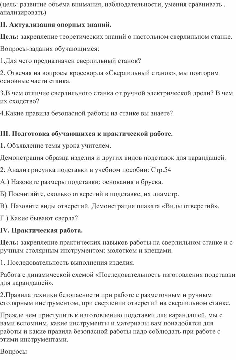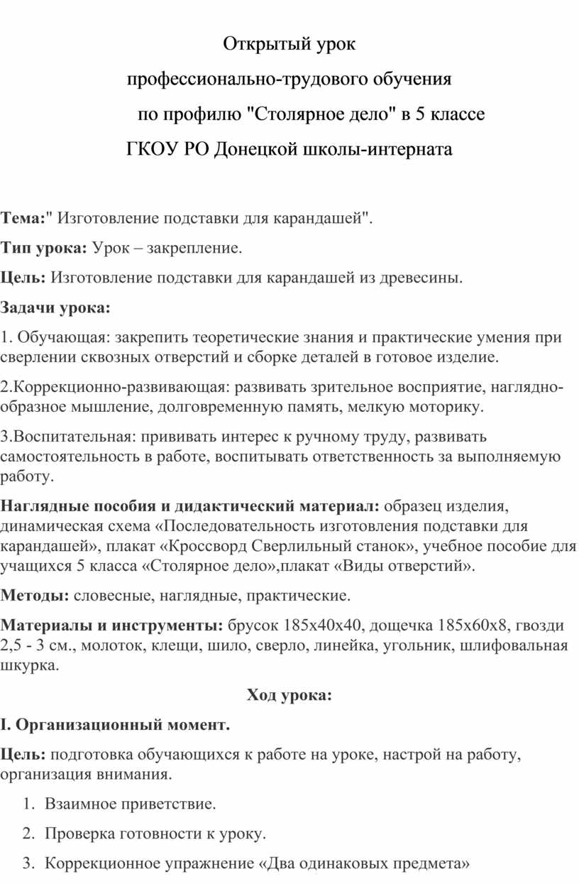 Наглядные пособия и дидактический материал: образец изделия, динамическая схема «Последовательность изготовления подставки для карандашей», плакат «Кроссворд Сверлильный станок», учебное пособие для учащихся 5 класса «Столярное дело»,плакат «Виды отверстий».