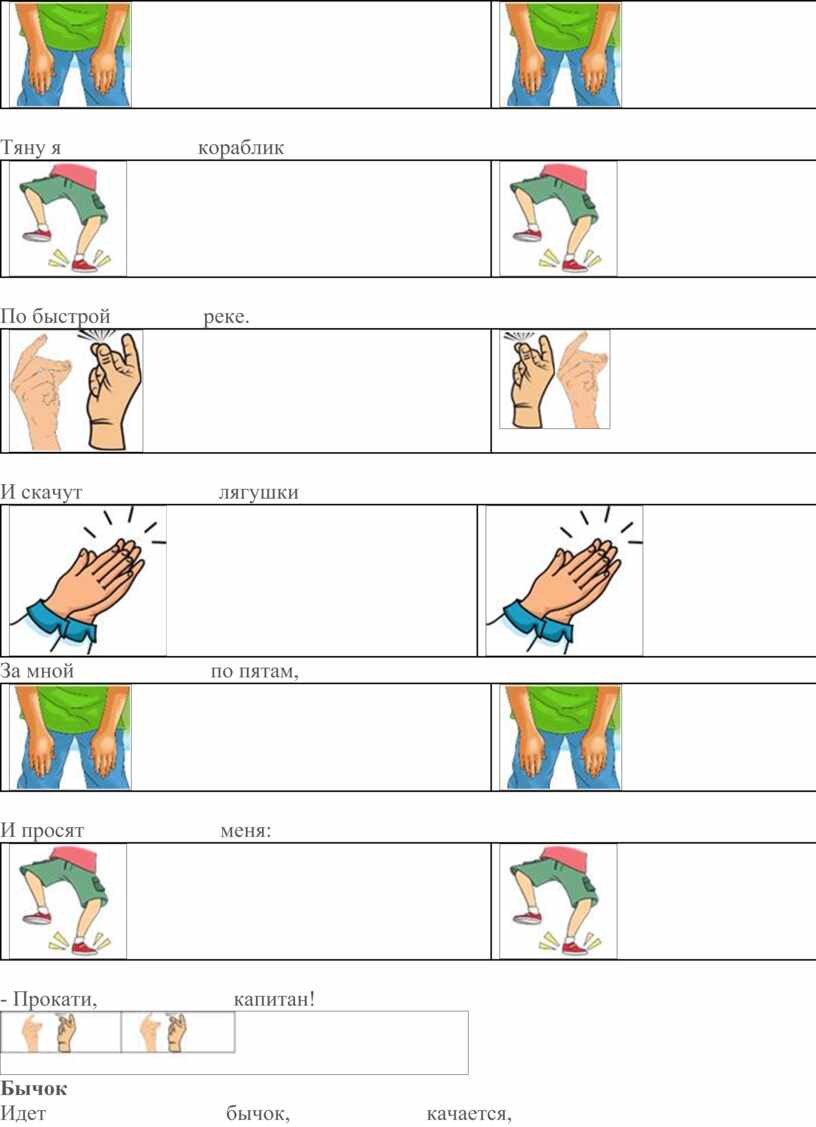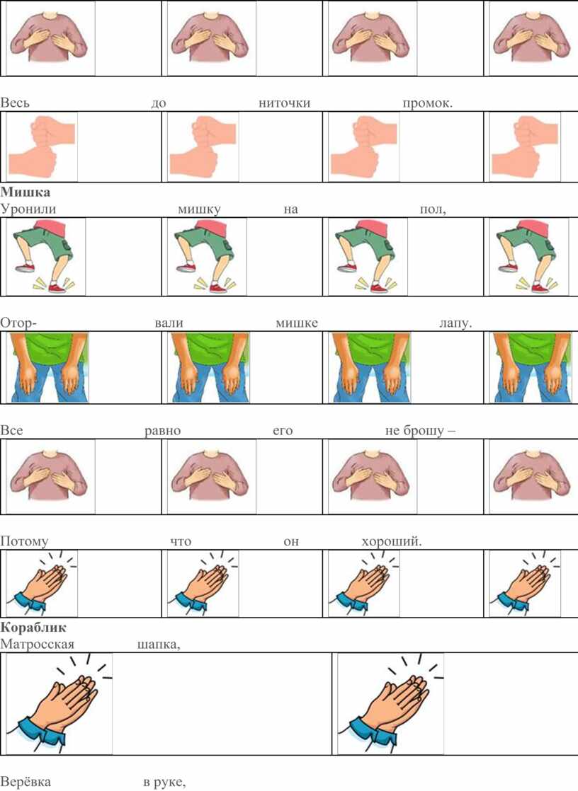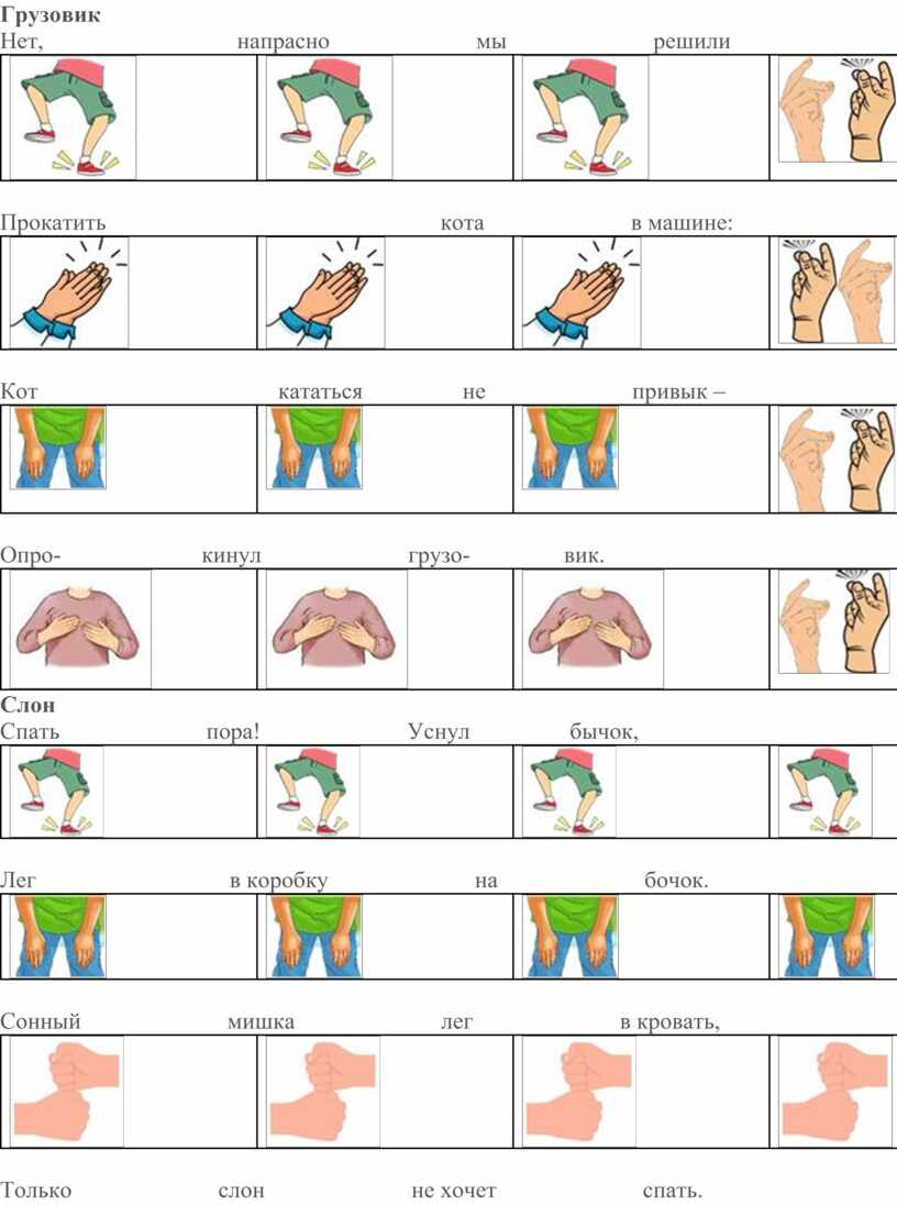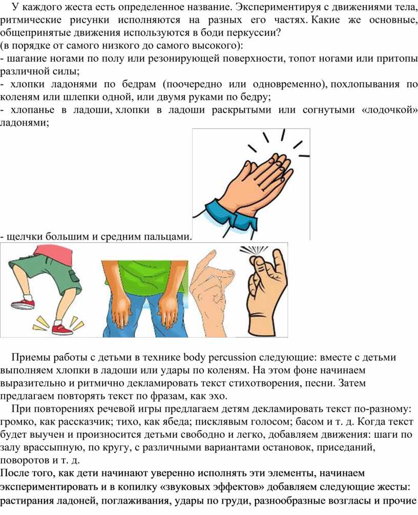 Приемы работы с детьми в технике body percussion следующие: вместе с детьми выполняем хлопки в ладоши или удары по коленям. На этом фоне начинаем выразительно и ритмично декламировать текст стихотворения, песни. Затем предлагаем повторять текст по фразам, как эхо.