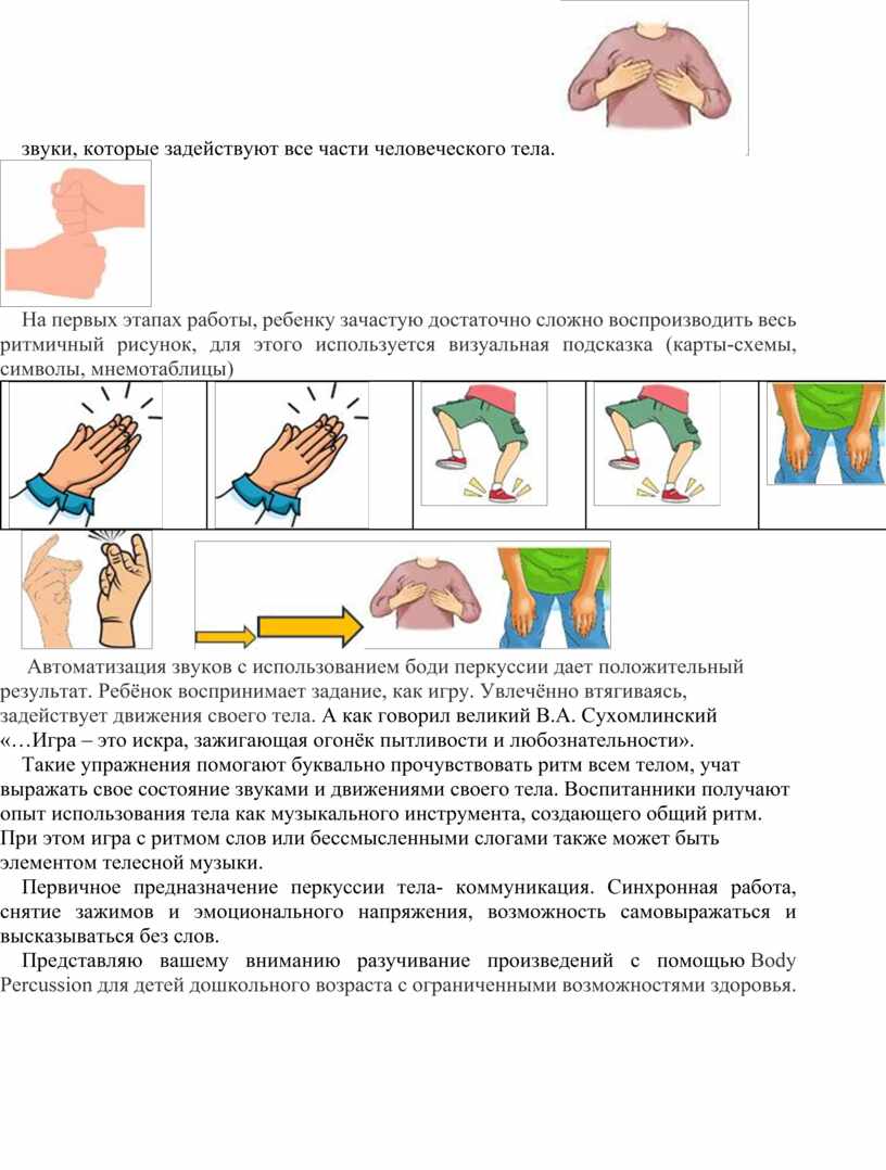 В детской психологии и методике развития речи дошкольников хорошо известна роль становления слуха и формирования ритмических способностей. Установлено, что сниженный слух и, как следствие этого, плохое восприятие ритмической структуры звуковой среды резко тормозит формирование экспрессивной речи в раннем возрасте. Если чувство ритма несовершенно, то замедляется становление развёрнутой (слитной) речи, она невыразительна и слабо интонирована; дошкольник говорит примитивно, используя короткие отрывочные высказывания. В этом случае на помощь придет простая и доступная техника – body percussion (перкуссия тела), техника владения своим телом как «музыкальным инструментом».