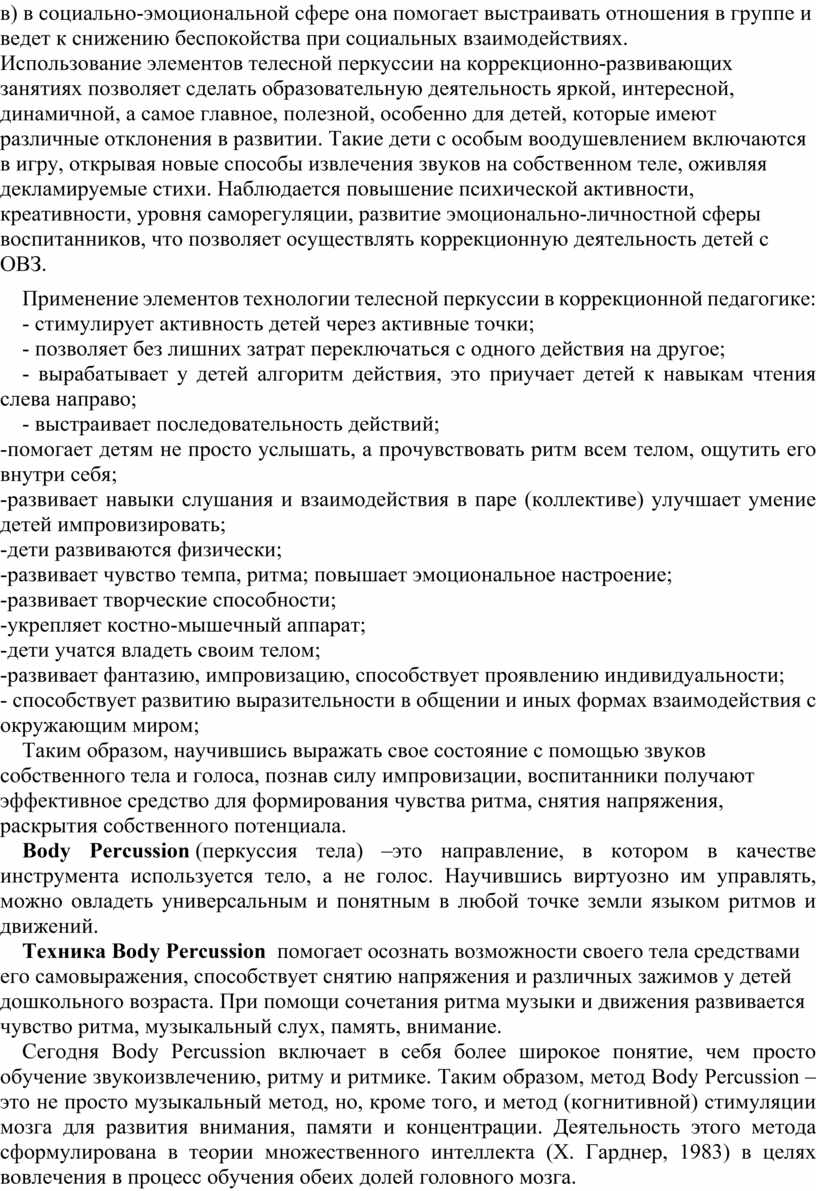 Использование элементов телесной перкуссии на коррекционно-развивающих занятиях позволяет сделать образовательную деятельность яркой, интересной, динамичной, а самое главное, полезной, особенно для детей, которые имеют различные отклонения в развитии. Такие дети с особым воодушевлением включаются в игру, открывая новые способы извлечения звуков на собственном теле, оживляя декламируемые стихи. Наблюдается повышение психической активности, креативности, уровня саморегуляции, развитие эмоционально-личностной сферы воспитанников, что позволяет осуществлять коррекционную деятельность детей с ОВЗ.