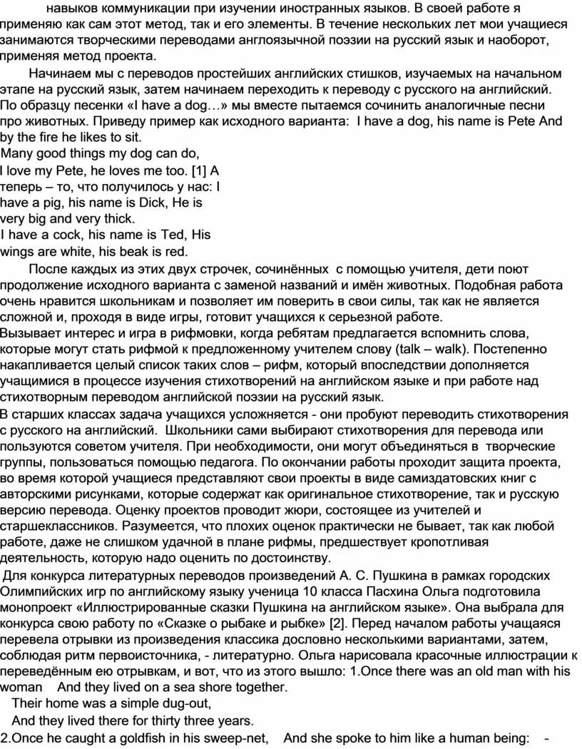 Статья содержит информацию из опыта работы учителя по развитию творческих, исследовательских и коммуникативных навыков учащихся при создании литературных переводов в контексте метода проекта.