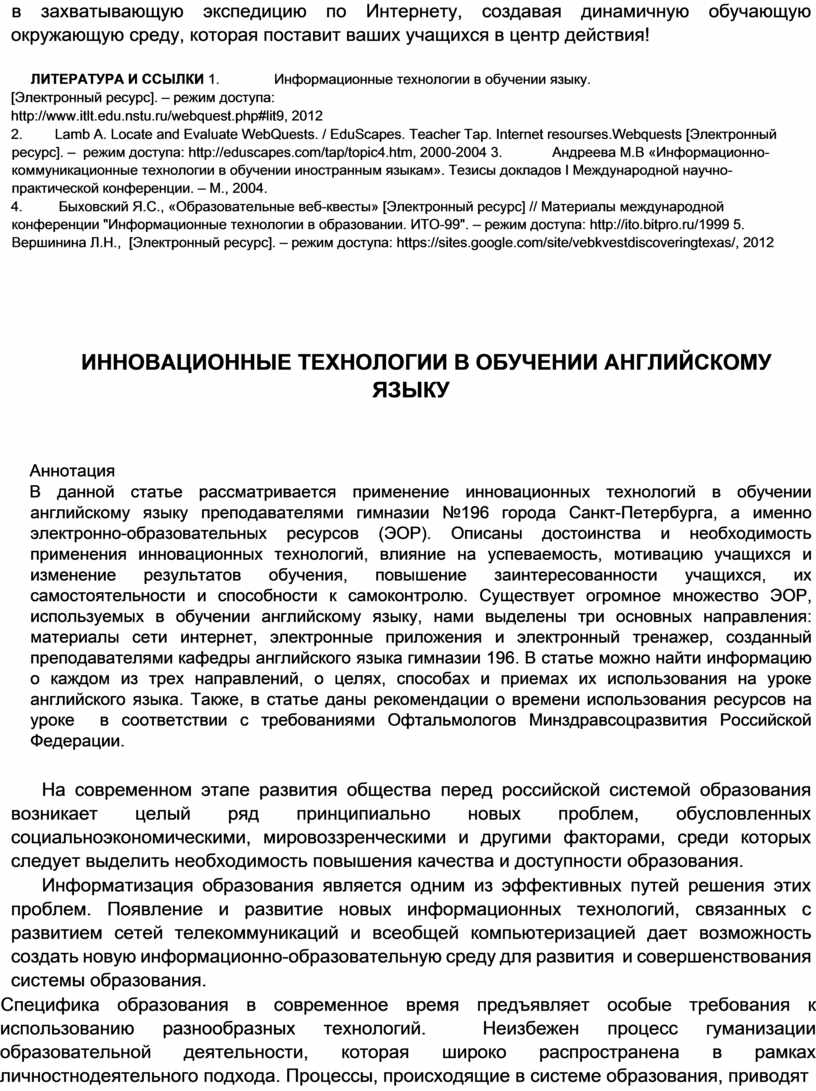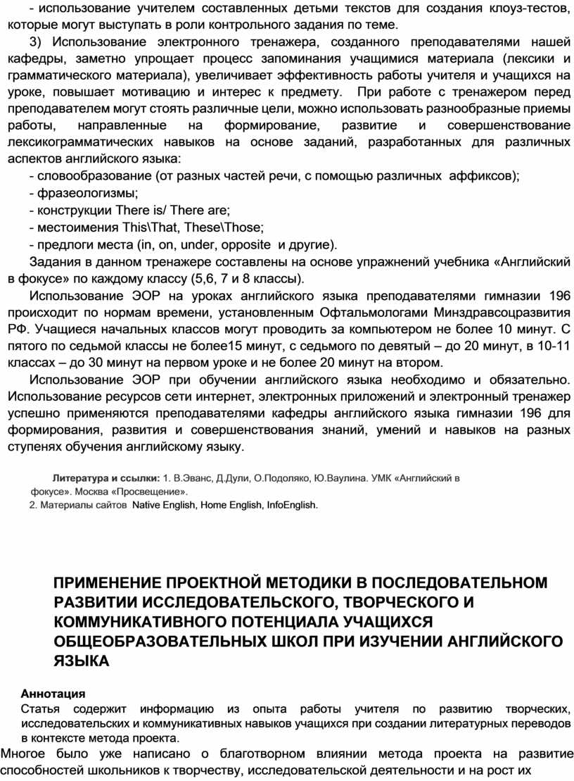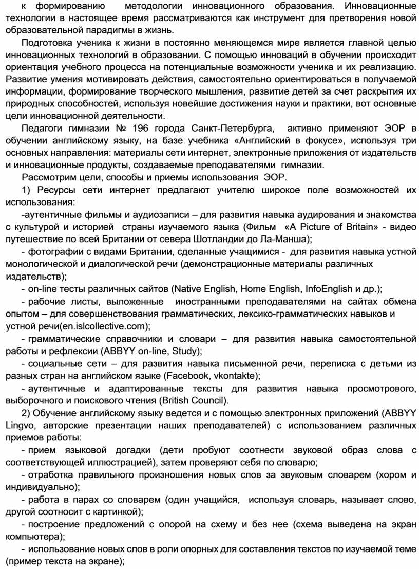 Использование ЭОР при обучении английского языка необходимо и обязательно. Использование ресурсов сети интернет, электронных приложений и электронный тренажер успешно применяются преподавателями кафедры английского языка гимназии 196 для формирования, развития и совершенствования знаний, умений и навыков на разных ступенях обучения английскому языку.