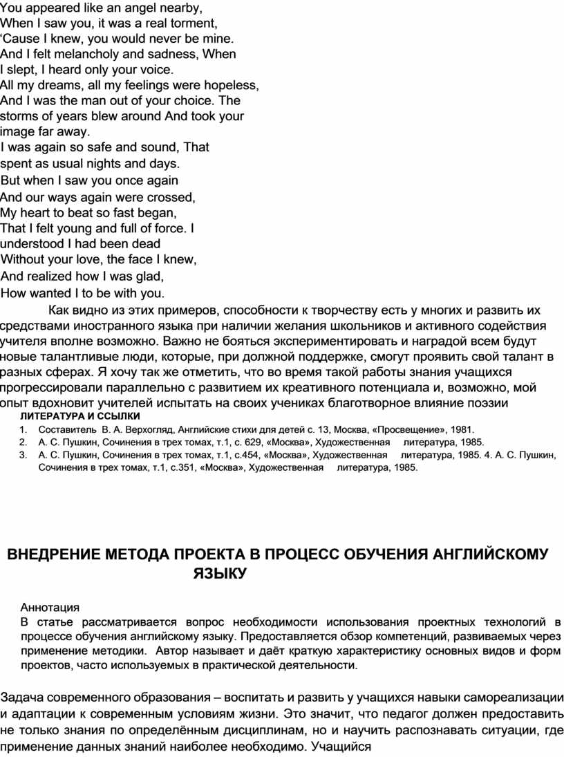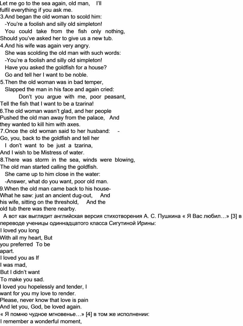А вот как выглядит английская версия стихотворения А. С. Пушкина « Я Вас любил…» [3] в переводе ученицы одиннадцатого класса Сигутиной Ирины: