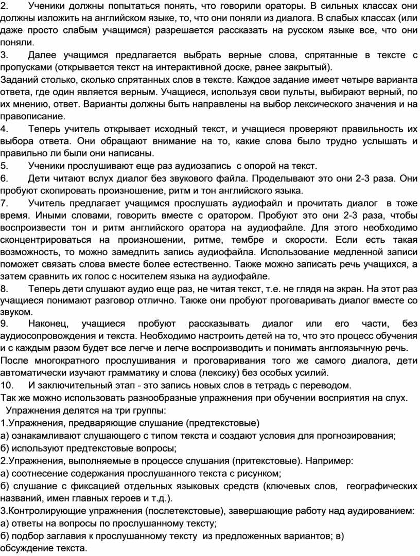Итак, как вы видите, в этой работе я попыталась описать основы для развития прослушивания, которые могут быть применены к любому прослушиванию текста. Разумеется это не единственный способ. Учитель может искать новые подходы в развитии понимания речи на слух.