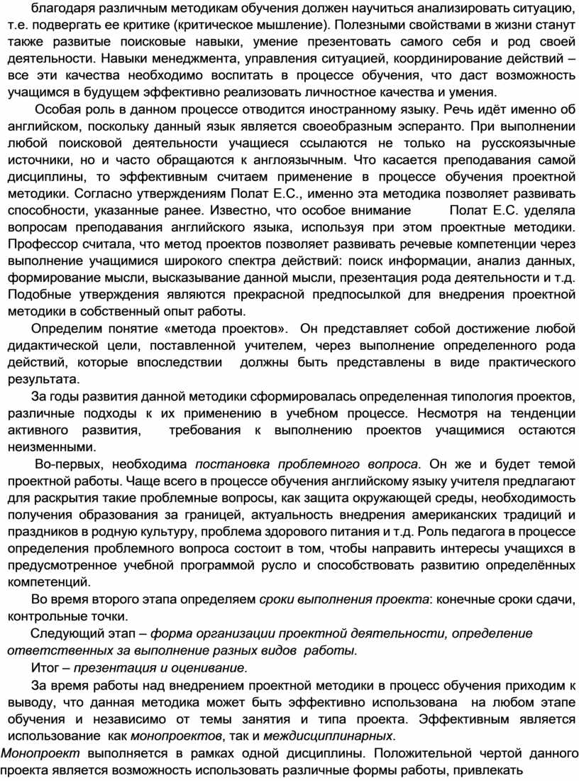 Особая роль в данном процессе отводится иностранному языку. Речь идёт именно об английском, поскольку данный язык является своеобразным эсперанто. При выполнении любой поисковой деятельности учащиеся ссылаются не только на русскоязычные источники, но и часто обращаются к англоязычным. Что касается преподавания самой дисциплины, то эффективным считаем применение в процессе обучения проектной методики. Согласно утверждениям Полат Е.С., именно эта методика позволяет развивать способности, указанные ранее. Известно, что особое внимание Полат Е.С. уделяла вопросам преподавания английского языка, используя при этом проектные методики. Профессор считала, что метод проектов позволяет развивать речевые компетенции через выполнение учащимися широкого спектра действий: поиск информации, анализ данных, формирование мысли, высказывание данной мысли, презентация рода деятельности и т.д. Подобные утверждения являются прекрасной предпосылкой для внедрения проектной методики в собственный опыт работы.
