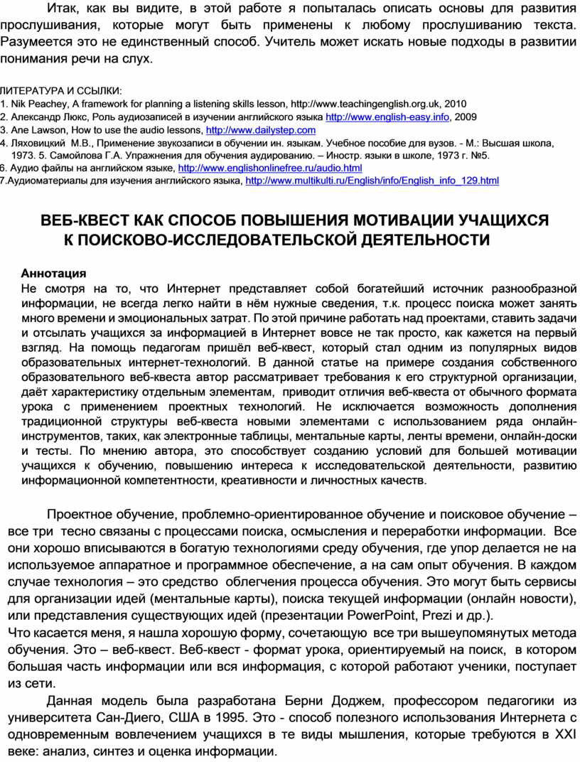 Что касается меня, я нашла хорошую форму, сочетающую все три вышеупомянутых метода обучения. Это – веб-квест. Веб-квест - формат урока, ориентируемый на поиск, в котором большая часть информации или вся информация, с которой работают ученики, поступает из сети.