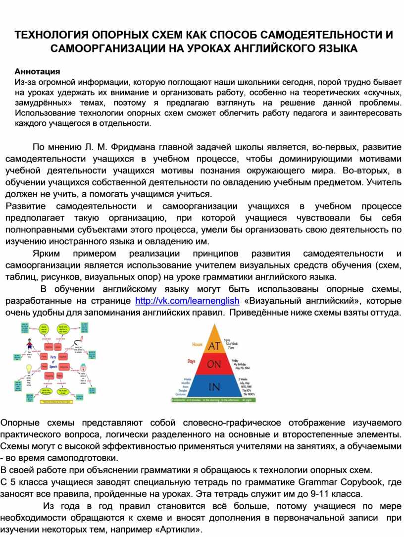 Ярким примером реализации принципов развития самодеятельности и самоорганизации является использование учителем визуальных средств обучения (схем, таблиц, рисунков, визуальных опор) на уроке грамматики английского языка.