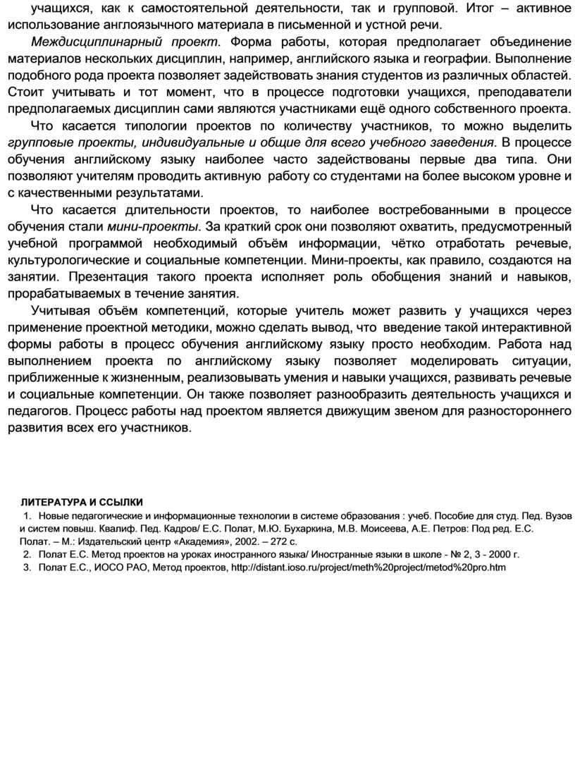 2. Полат Е.С. Метод проектов на уроках иностранного языка/ Иностранные языки в школе - № 2, 3 - 2000 г.