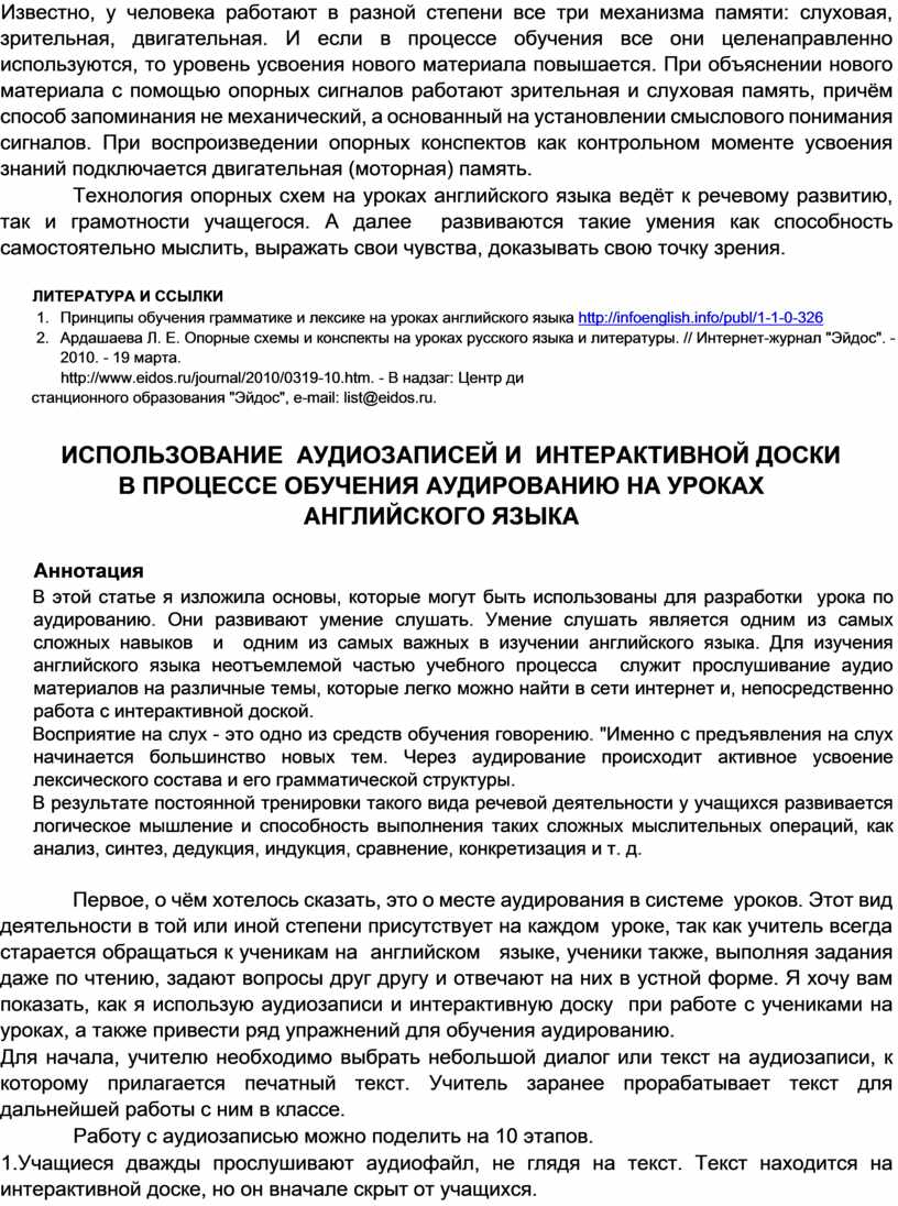 В этой статье я изложила основы, которые могут быть использованы для разработки урока по аудированию. Они развивают умение слушать. Умение слушать является одним из самых сложных навыков и одним из самых важных в изучении английского языка. Для изучения английского языка неотъемлемой частью учебного процесса служит прослушивание аудио материалов на различные темы, которые легко можно найти в сети интернет и, непосредственно работа с интерактивной доской.
