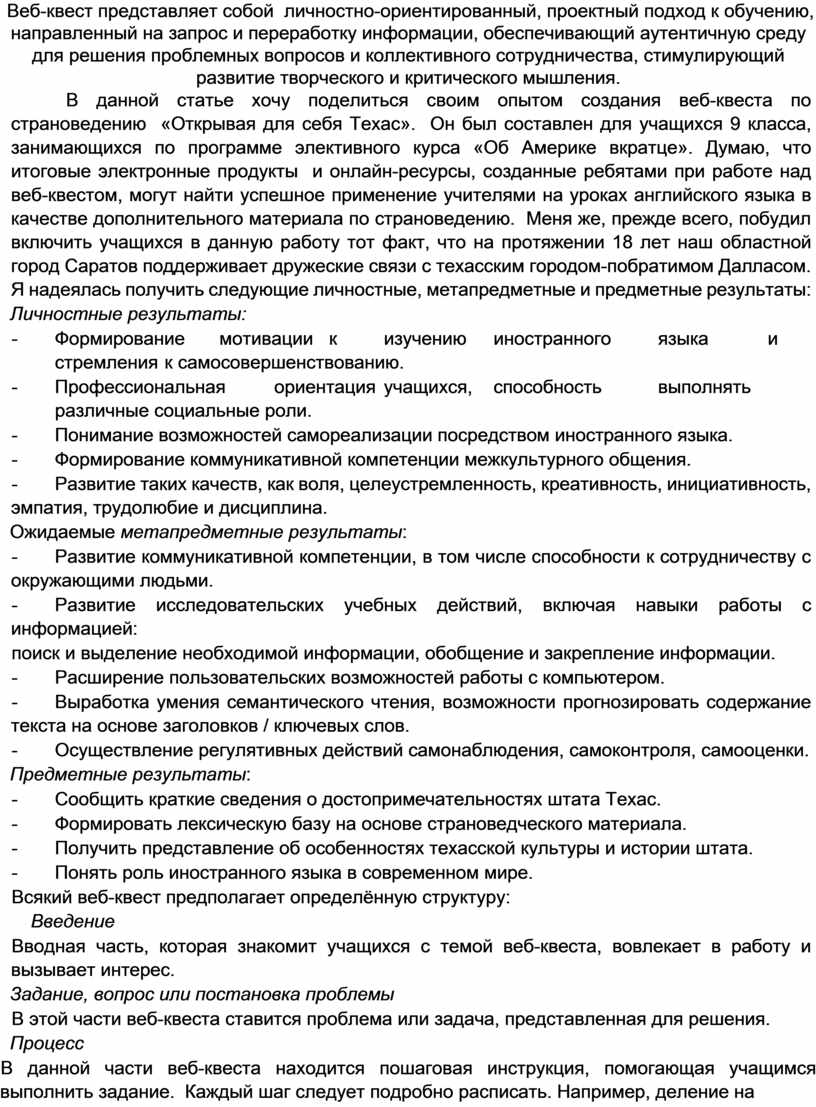 В данной статье хочу поделиться своим опытом создания веб-квеста по страноведению «Открывая для себя Техас». Он был составлен для учащихся 9 класса, занимающихся по программе элективного курса «Об Америке вкратце». Думаю, что итоговые электронные продукты и онлайн-ресурсы, созданные ребятами при работе над веб-квестом, могут найти успешное применение учителями на уроках английского языка в качестве дополнительного материала по страноведению. Меня же, прежде всего, побудил включить учащихся в данную работу тот факт, что на протяжении 18 лет наш областной город Саратов поддерживает дружеские связи с техасским городом-побратимом Далласом. Я надеялась получить следующие личностные, метапредметные и предметные результаты: