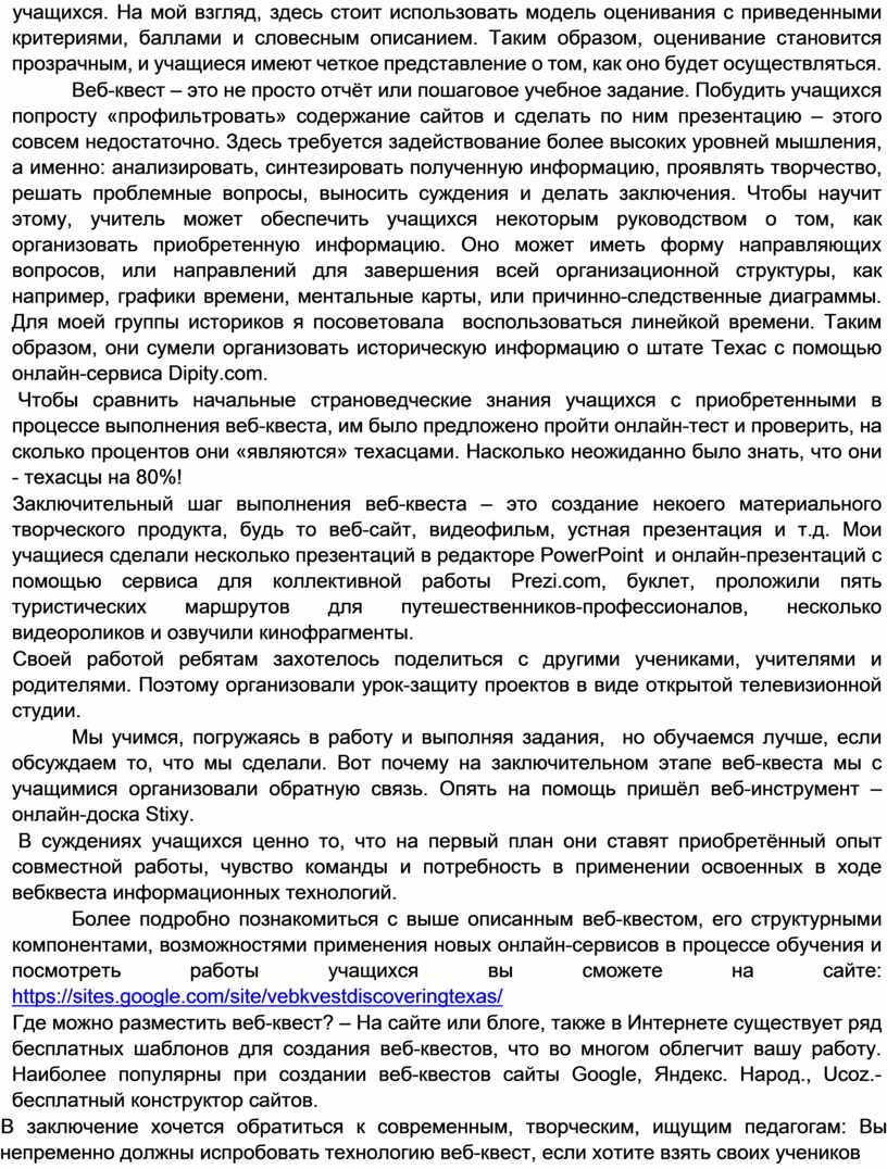 Более подробно познакомиться с выше описанным веб-квестом, его структурными компонентами, возможностями применения новых онлайн-сервисов в процессе обучения и посмотреть работы учащихся вы сможете на сайте: https://sites.google.com/site/vebkvestdiscoveringtexas/