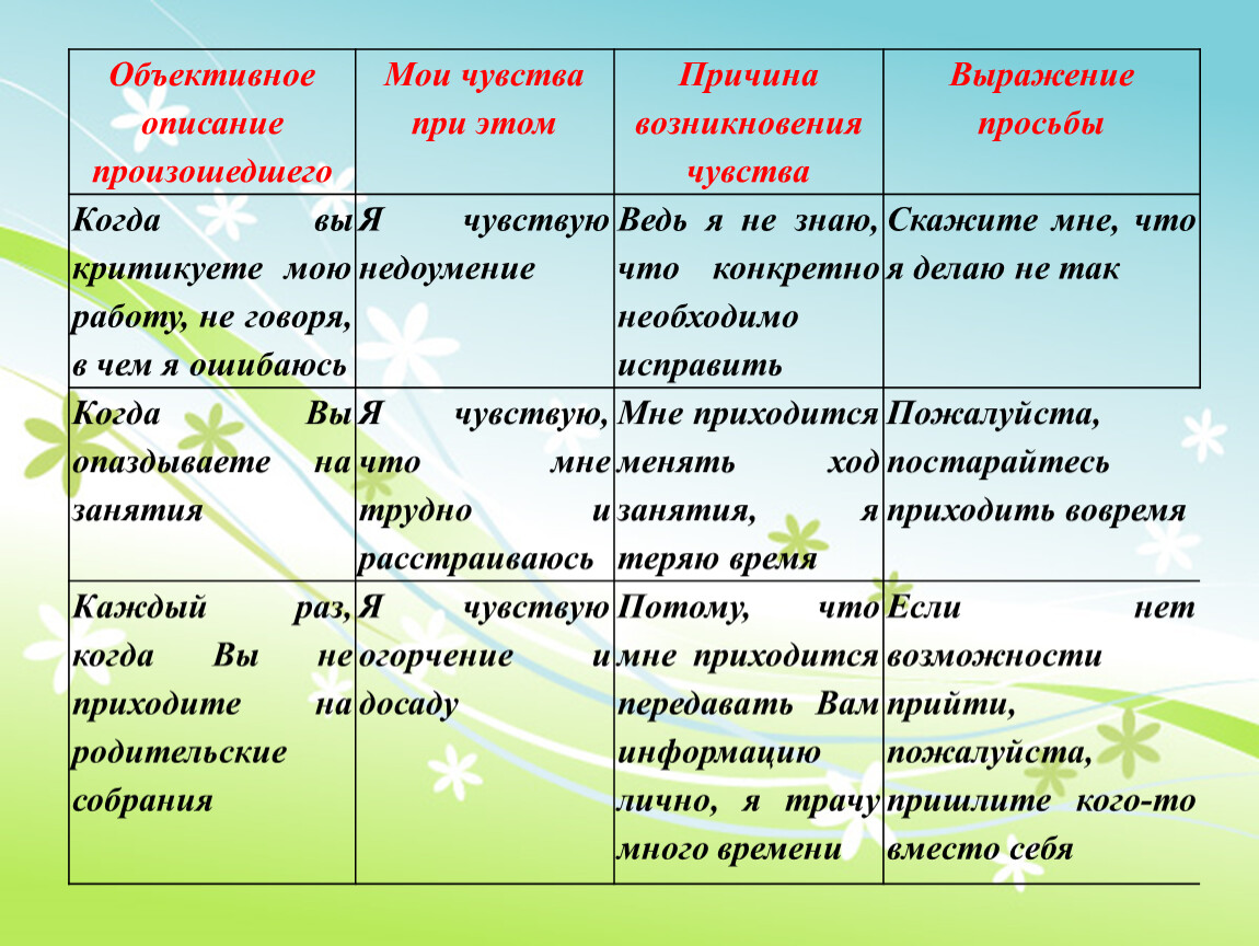 Объективное описание произошедшего | Мои чувства при этом | Причина возникновения чувства | Выражение просьбы |