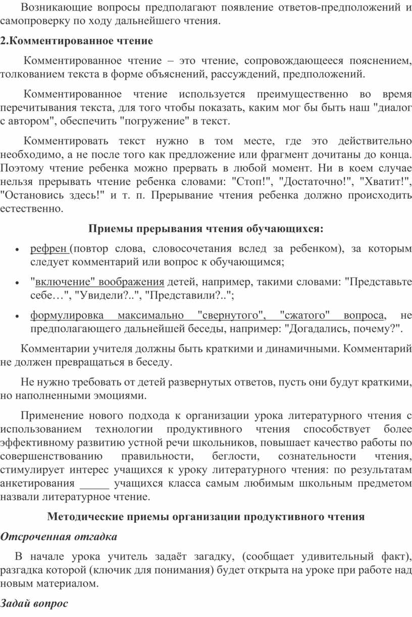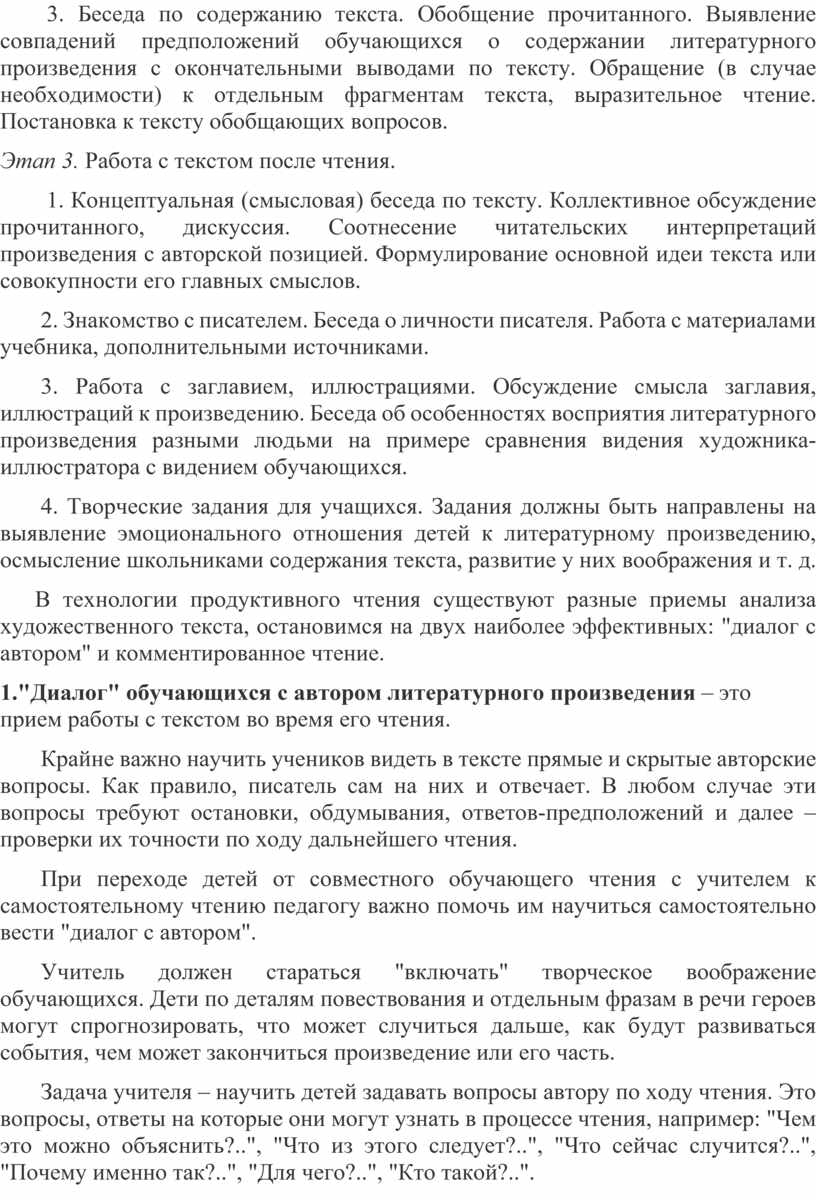 В технологии продуктивного чтения существуют разные приемы анализа художественного текста, остановимся на двух наиболее эффективных: "диалог с автором" и комментированное чтение.