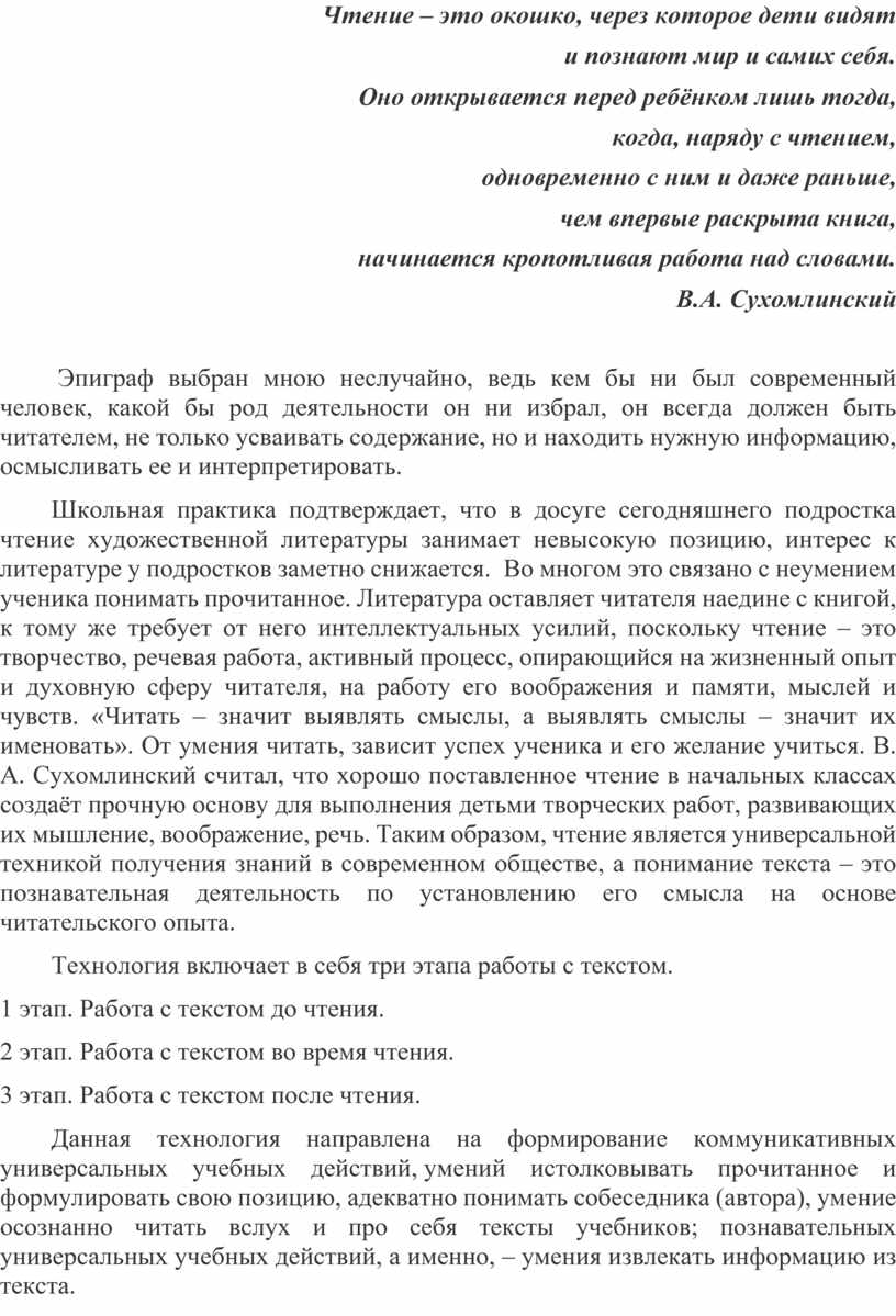 Школьная практика подтверждает, что в досуге сегодняшнего подростка чтение художественной литературы занимает невысокую позицию, интерес к литературе у подростков заметно снижается. Во многом это связано с неумением ученика понимать прочитанное. Литература оставляет читателя наедине с книгой, к тому же требует от него интеллектуальных усилий, поскольку чтение – это творчество, речевая работа, активный процесс, опирающийся на жизненный опыт и духовную сферу читателя, на работу его воображения и памяти, мыслей и чувств. «Читать – значит выявлять смыслы, а выявлять смыслы – значит их именовать». От умения читать, зависит успех ученика и его желание учиться. В. А. Сухомлинский считал, что хорошо поставленное чтение в начальных классах создаёт прочную основу для выполнения детьми творческих работ, развивающих их мышление, воображение, речь. Таким образом, чтение является универсальной техникой получения знаний в современном обществе, а понимание текста – это познавательная деятельность по установлению его смысла на основе читательского опыта.