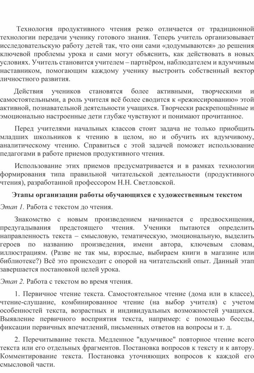 Использование этих приемов предусматривается и в рамках технологии формирования типа правильной читательской деятельности (продуктивного чтения), разработанной профессором Н.Н. Светловской.