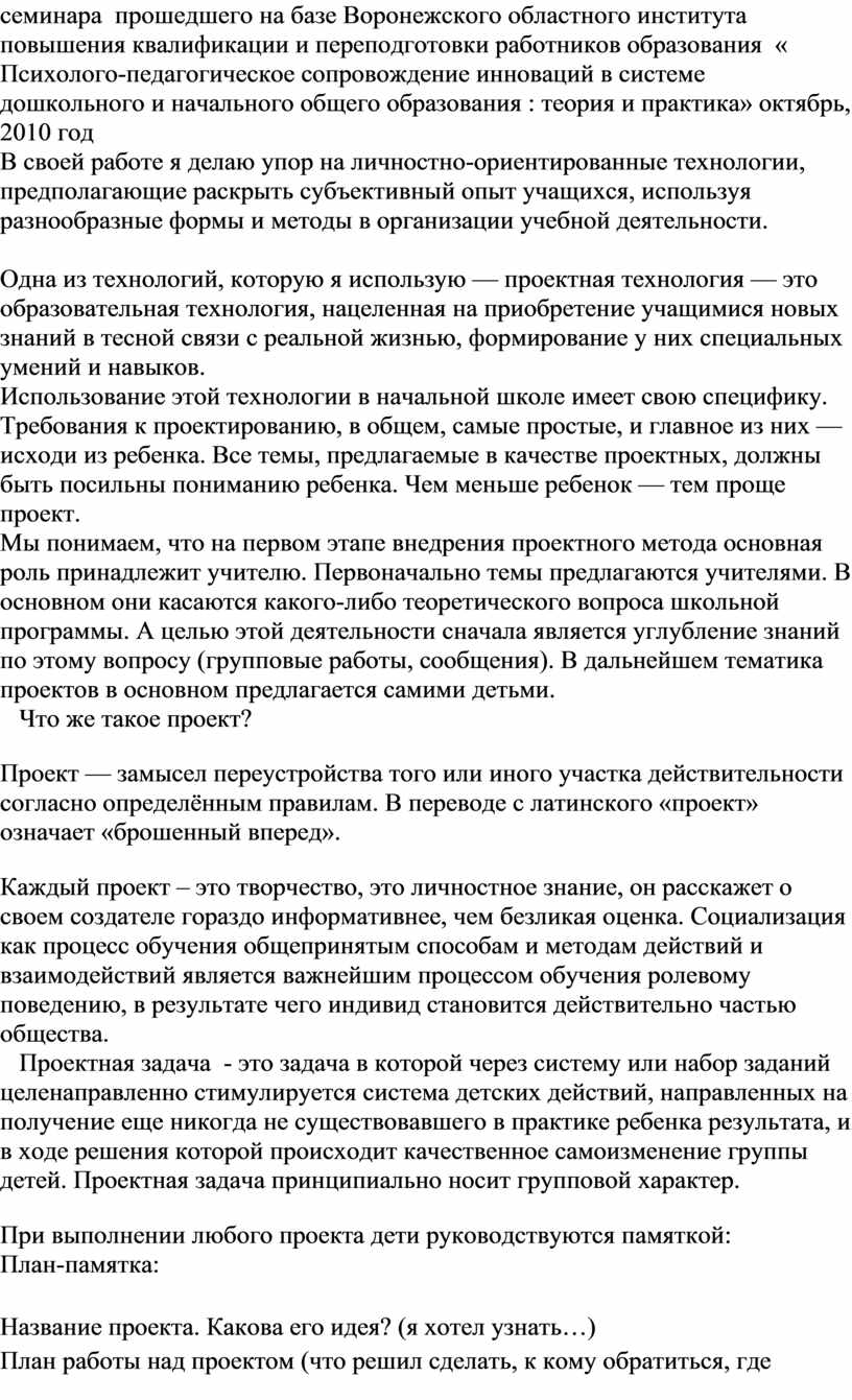 Выясним, достаточно ли развиты у младших школьников необходимые качества и умения? Готовы ли дети этого возраста к такой деятельности? Ответ: конечно же нет! Нужна поэтапная работа по обучению этому виду деятельности. И прежде чем учить этому детей, мы – педагоги - должны сами освоить эту интересную и эффективную технологию. Лично мне помогли в этом разобраться материалы межрегионального научно – практического семинара прошедшего на базе Воронежского областного института повышения квалификации и переподготовки работников образования « Психолого-педагогическое сопровождение инноваций в системе дошкольного и начального общего образования : теория и практика» октябрь, 2010 год