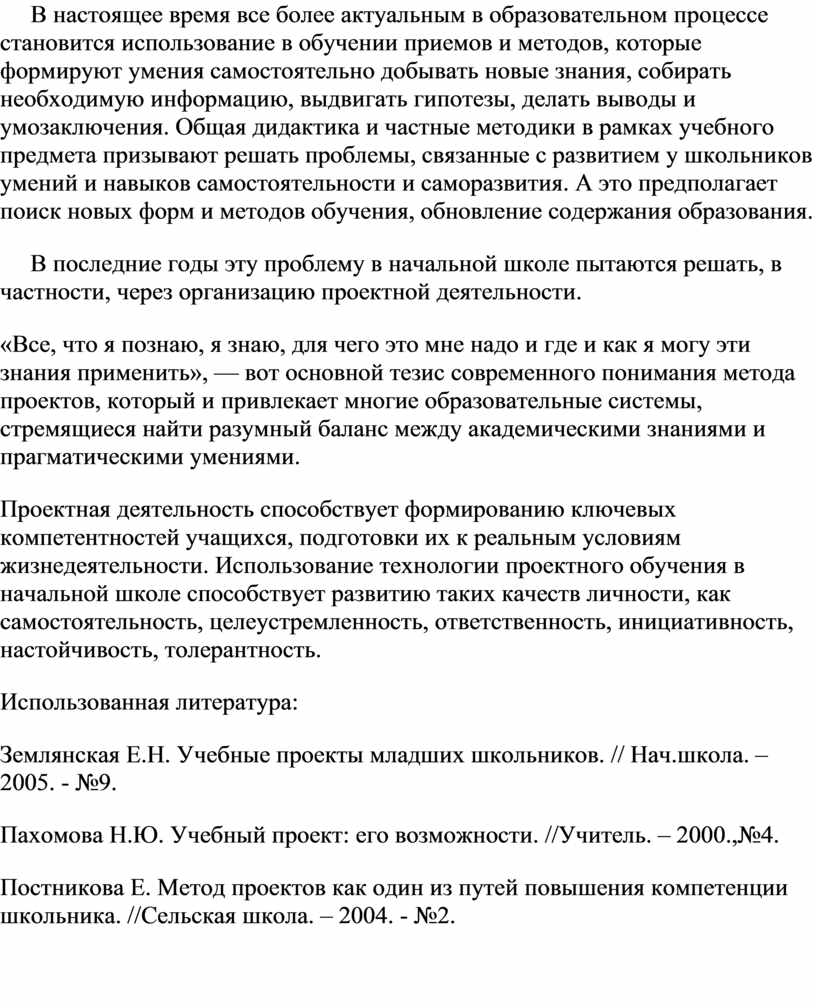 Постникова Е. Метод проектов как один из путей повышения компетенции школьника. //Сельская школа. – 2004. - №2.
