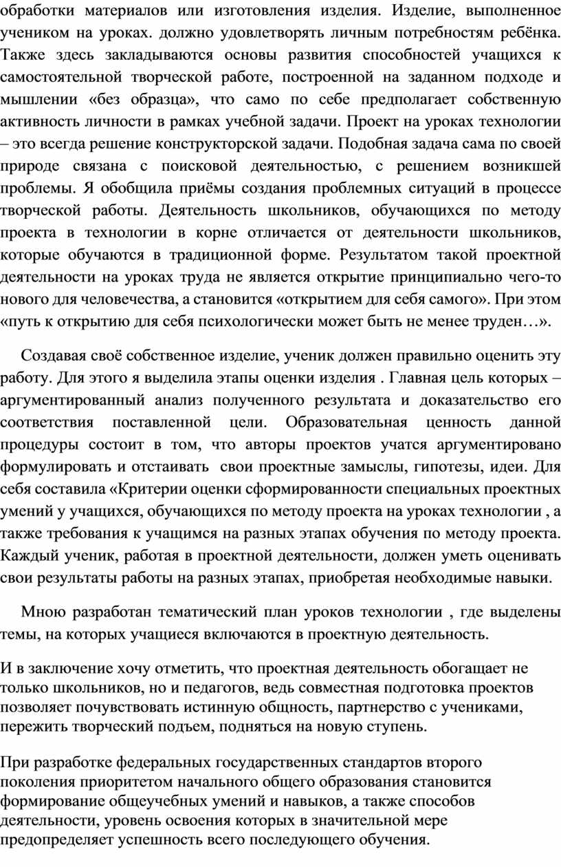 обработки материалов или изготовления изделия. Изделие, выполненное учеником на уроках. должно удовлетворять личным потребностям ребёнка. Также здесь закладываются основы развития способностей учащихся к самостоятельной творческой работе, построенной на заданном подходе и мышлении «без образца», что само по себе предполагает собственную активность личности в рамках учебной задачи. Проект на уроках технологии – это всегда решение конструкторской задачи. Подобная задача сама по своей природе связана с поисковой деятельностью, с решением возникшей проблемы. Я обобщила приёмы создания проблемных ситуаций в процессе творческой работы. Деятельность школьников, обучающихся по методу проекта в технологии в корне отличается от деятельности школьников, которые обучаются в традиционной форме. Результатом такой проектной деятельности на уроках труда не является открытие принципиально чего-то нового для человечества, а становится «открытием для себя самого». При этом «путь к открытию для себя психологически может быть не менее труден…».