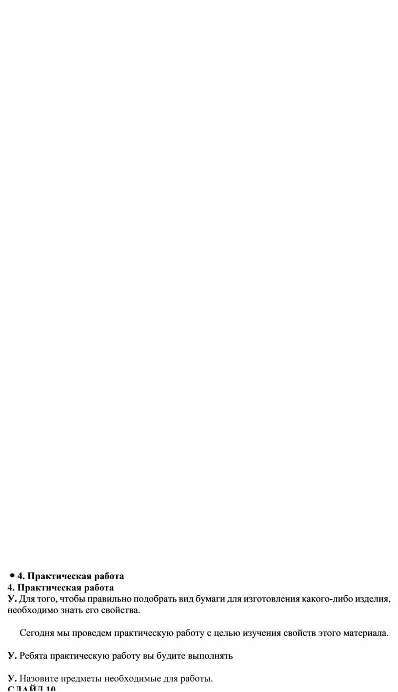 4. Практическая работа У. Для того, чтобы правильно подобрать вид бумаги для изготовления какого-либо изделия, необходимо знать его свойства. Сегодня мы проведем практическую работу с целью изучения свойств этого материала. У. Ребята практическую работу вы будите выполнять У. Назовите предметы необходимые для работы. СЛАЙД 10