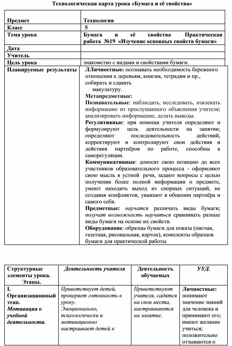 Технологическая карта урока «Бумага и её свойства»