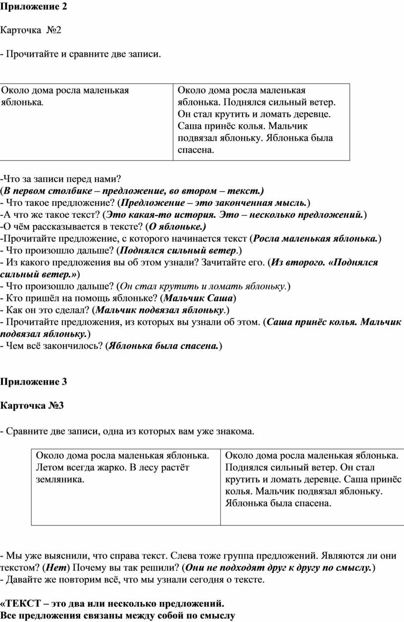 Различение текста и не текста. - Итак, мы сказали, что «текст – это два или несколько предложений». Как вы думаете, любую ли группу предложений можно назвать текстом? -Сравните две записи, одна из которых вам уже знакома. Приложение 3