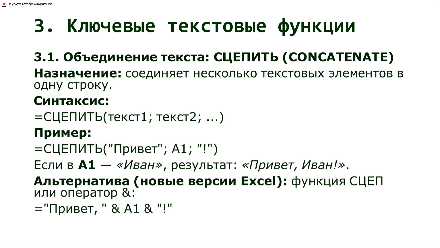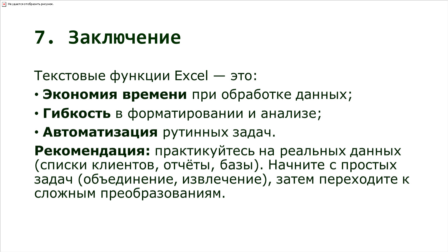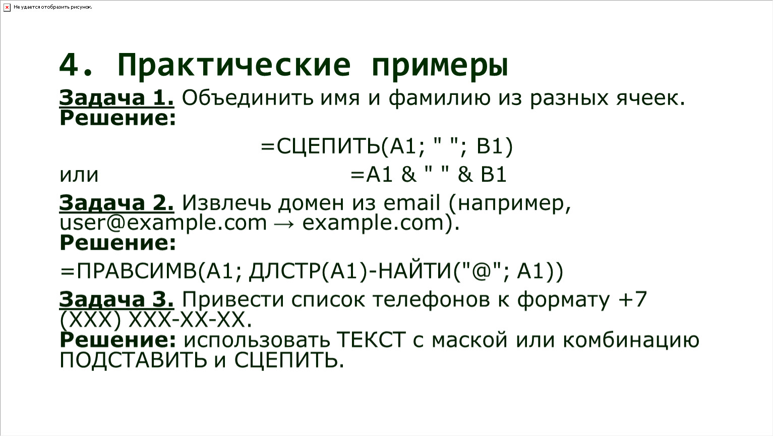 Рекомендация: практикуйтесь на реальных данных (списки клиентов, отчёты, базы). Начните с простых задач (объединение, извлечение), затем переходите к сложным преобразованиям.