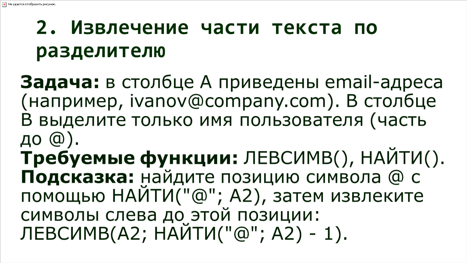Задача: в столбце A приведены email‑адреса (например, ivanov@company.com). В столбце B выделите только имя пользователя (часть до @).Требуемые функции: ЛЕВСИМВ(), НАЙТИ().Подсказка: найдите позицию символа @ с помощью НАЙТИ("@"; A2), затем извлеките символы слева до этой позиции: ЛЕВСИМВ(A2; НАЙТИ("@"; A2) - 1).