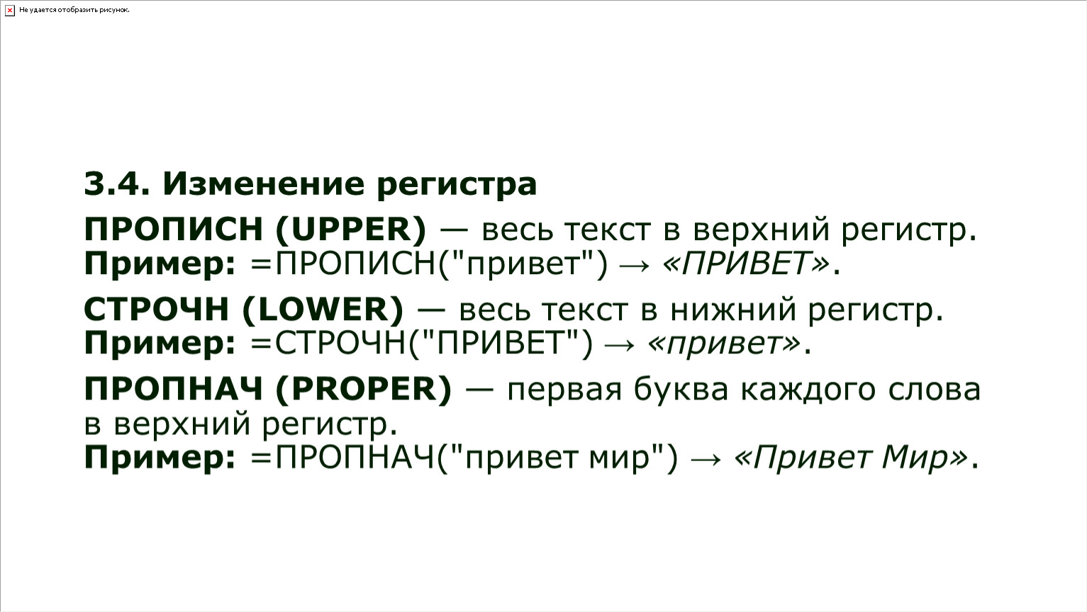 СТРОЧН (LOWER) — весь текст в нижний регистр.Пример: =СТРОЧН("ПРИВЕТ") → «привет».