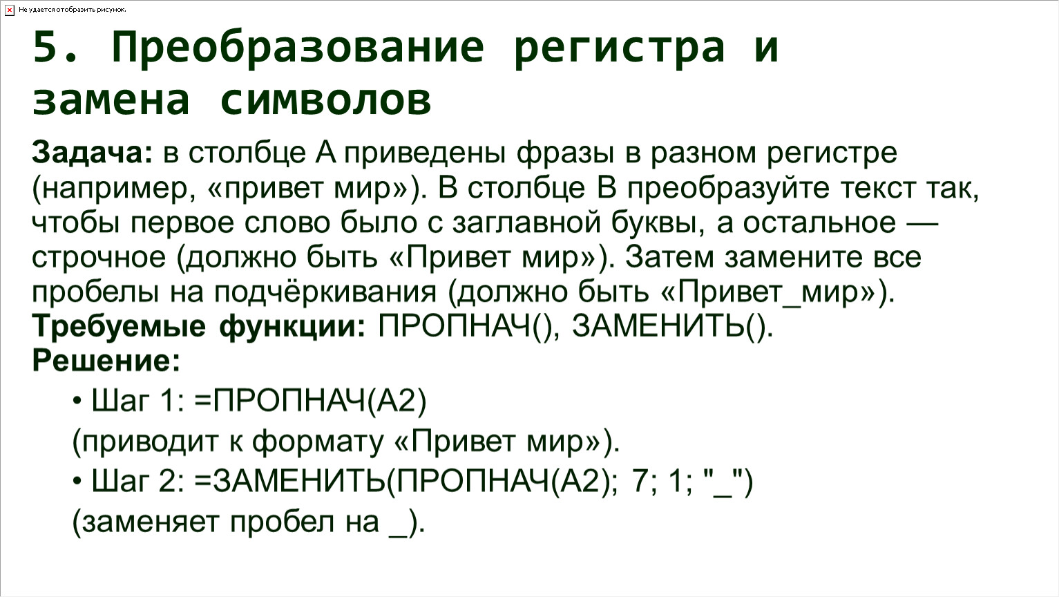 Задача: в столбце A приведены фразы в разном регистре (например, «привет мир»). В столбце B преобразуйте текст так, чтобы первое слово было с заглавной буквы, а остальное — строчное (должно быть «Привет мир»). Затем замените все пробелы на подчёркивания (должно быть «Привет_мир»).Требуемые функции: ПРОПНАЧ(), ЗАМЕНИТЬ().Решение:
