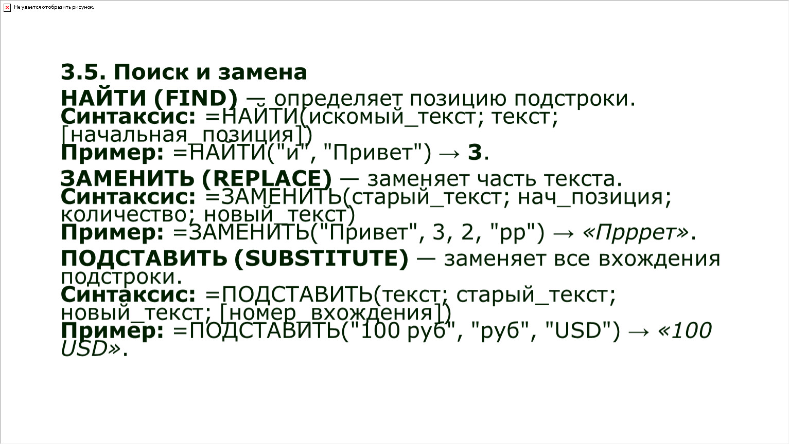 ЗАМЕНИТЬ (REPLACE) — заменяет часть текста.Синтаксис: =ЗАМЕНИТЬ(старый_текст; нач_позиция; количество; новый_текст)Пример: =ЗАМЕНИТЬ("Привет", 3, 2, "рр") → «Прррет».