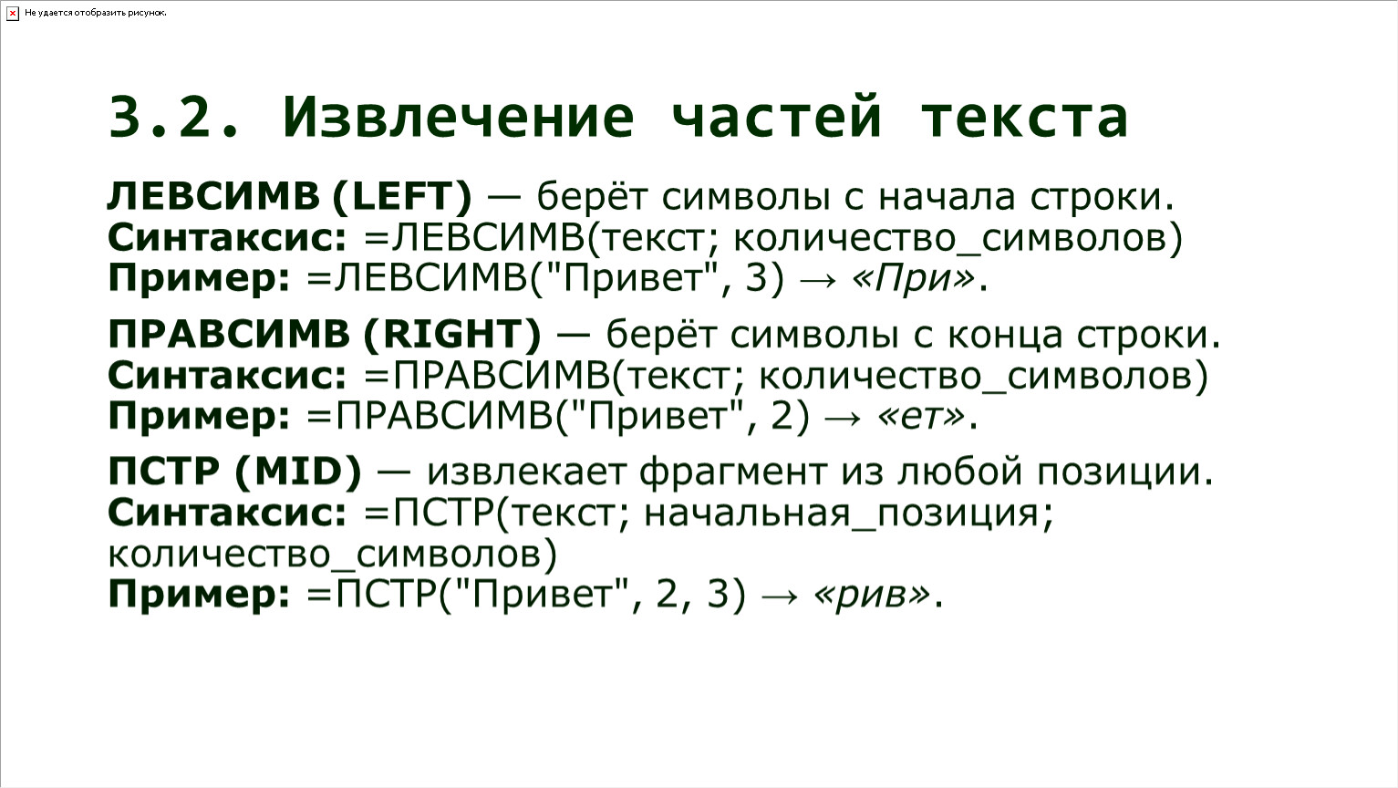 ПСТР (MID) — извлекает фрагмент из любой позиции.Синтаксис: =ПСТР(текст; начальная_позиция; количество_символов)Пример: =ПСТР("Привет", 2, 3) → «рив».