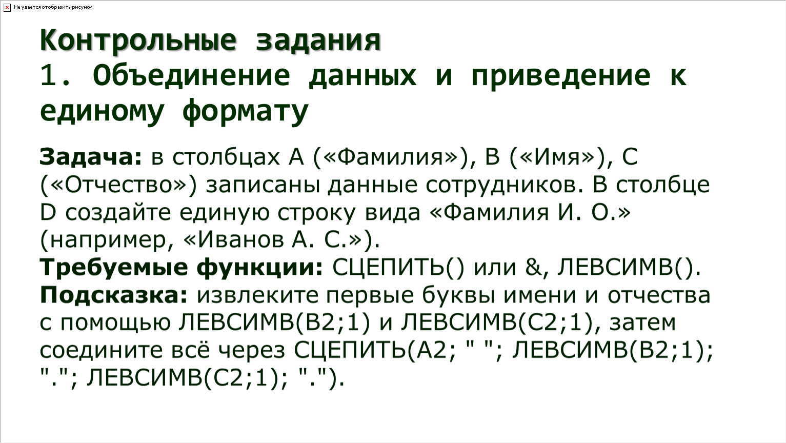 Задача: в столбцах A («Фамилия»), B («Имя»), C («Отчество») записаны данные сотрудников. В столбце D создайте единую строку вида «Фамилия И. О.» (например, «Иванов А. С.»).Требуемые функции: СЦЕПИТЬ() или &, ЛЕВСИМВ().Подсказка: извлеките первые буквы имени и отчества с помощью ЛЕВСИМВ(B2;1) и ЛЕВСИМВ(C2;1), затем соедините всё через СЦЕПИТЬ(A2; " "; ЛЕВСИМВ(B2;1); "."; ЛЕВСИМВ(C2;1); ".").