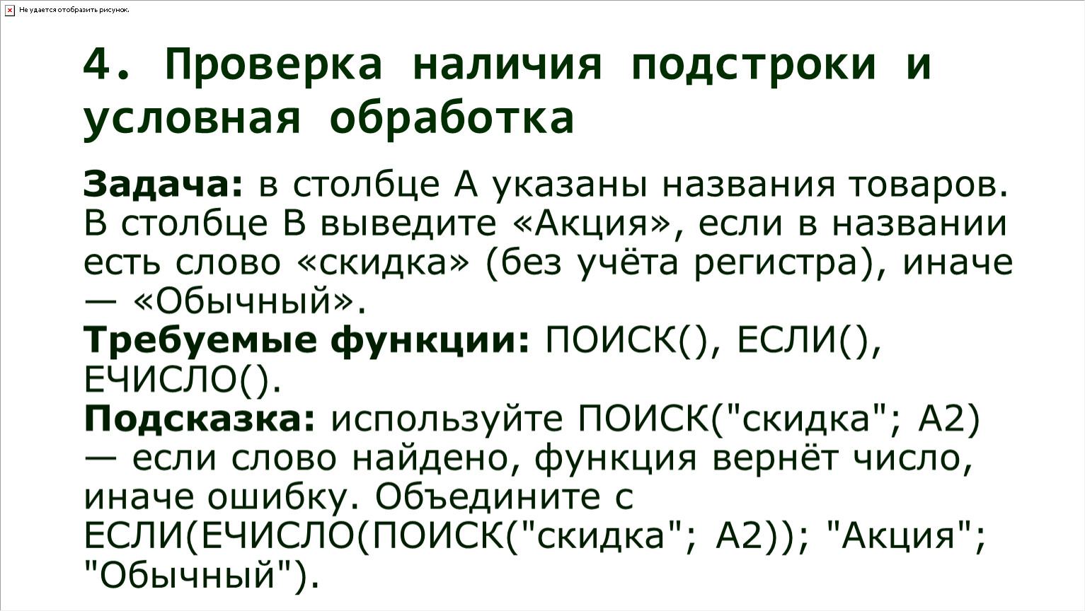Задача: в столбце A указаны названия товаров. В столбце B выведите «Акция», если в названии есть слово «скидка» (без учёта регистра), иначе — «Обычный».Требуемые функции: ПОИСК(), ЕСЛИ(), ЕЧИСЛО().Подсказка: используйте ПОИСК("скидка"; A2) — если слово найдено, функция вернёт число, иначе ошибку. Объедините с ЕСЛИ(ЕЧИСЛО(ПОИСК("скидка"; A2)); "Акция"; "Обычный").