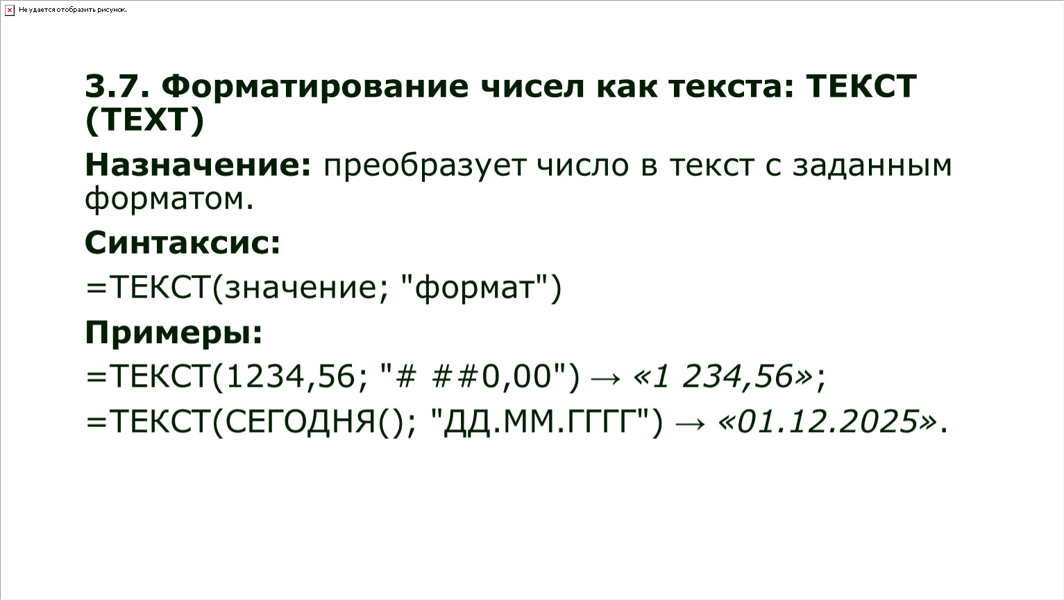 3.7. Форматирование чисел как текста: ТЕКСТ (TEXT)