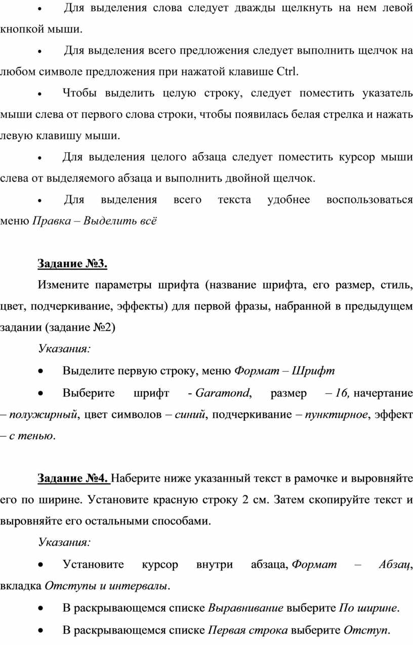 Задание №4. Наберите ниже указанный текст в рамочке и выровняйте его по ширине. Установите красную строку 2 см. Затем скопируйте текст и выровняйте его остальными способами.