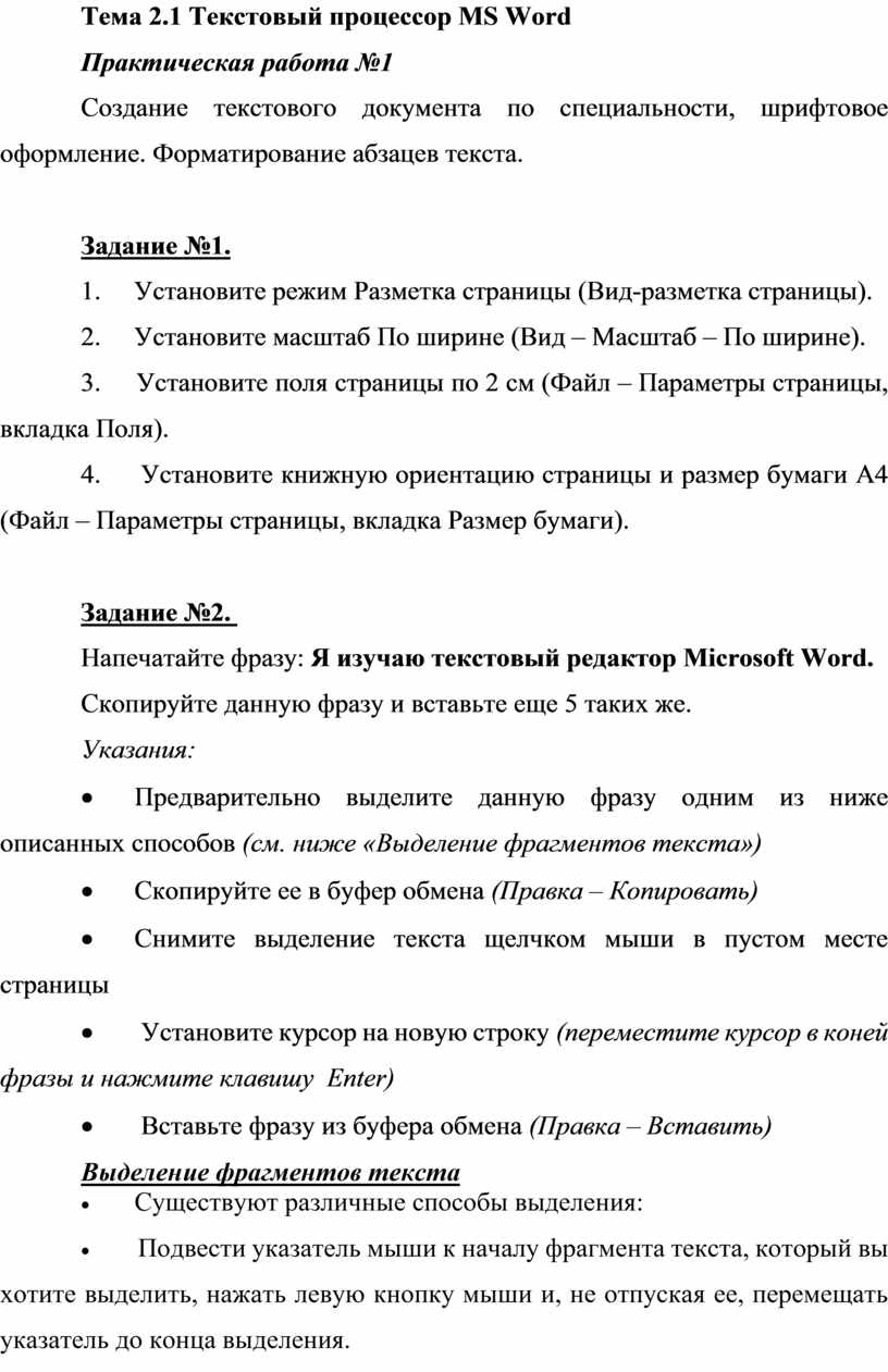 Создание текстового документа по специальности, шрифтовое оформление. Форматирование абзацев текста.