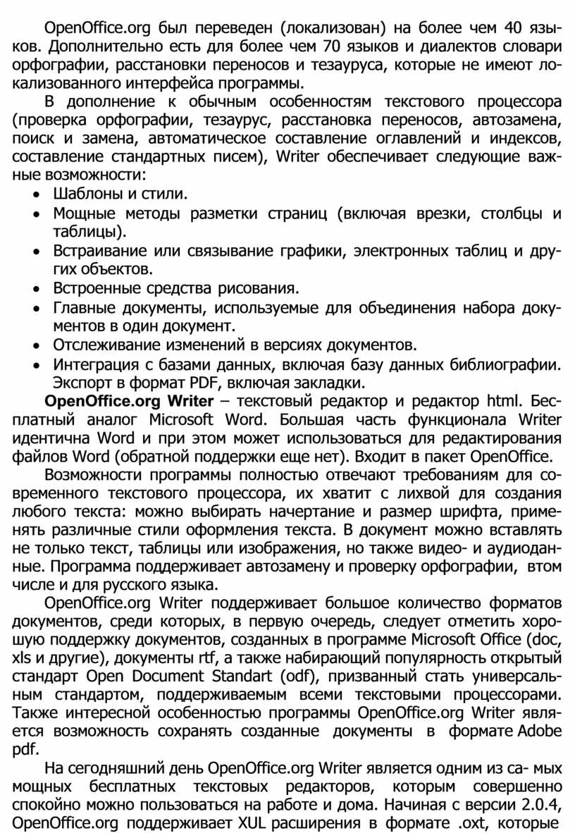 · обширная языковая поддержка – интерфейс OpenOffice.org досту- пен на более чем 40 языках. Кроме этого, для 70 языков имеются орфографические словари, словари переносов, тезауруса и диа- лектов;