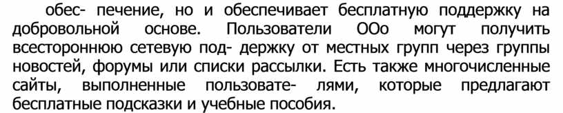 Сообщество OpenOffice.org не только развивает программное обес- печение, но и обеспечивает бесплатную поддержку на добровольной основе. Пользователи OOo могут получить всестороннюю сетевую под- держку от местных групп через группы новостей, форумы или списки рассылки. Есть также многочисленные сайты, выполненные пользовате- лями, которые предлагают бесплатные подсказки и учебные пособия.