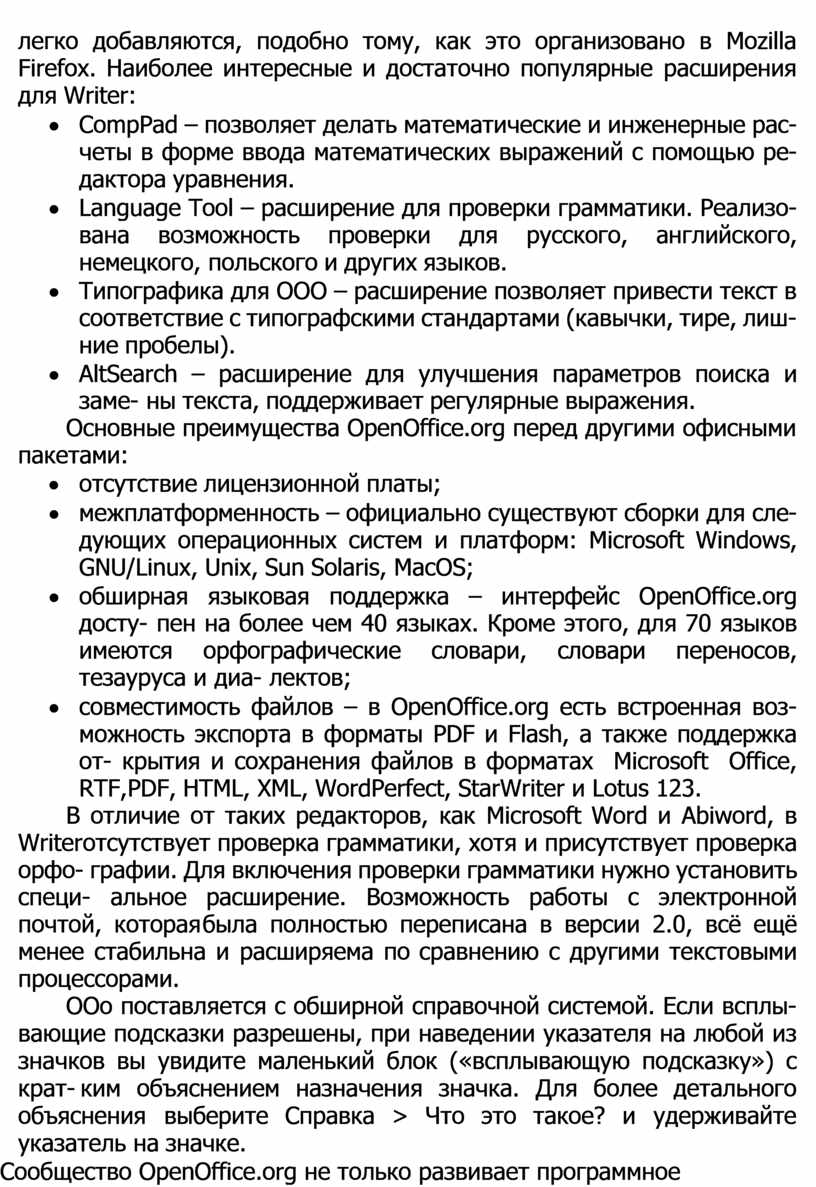 легко добавляются, подобно тому, как это организовано в Mozilla Firefox. Наиболее интересные и достаточно популярные расширения для Writer: