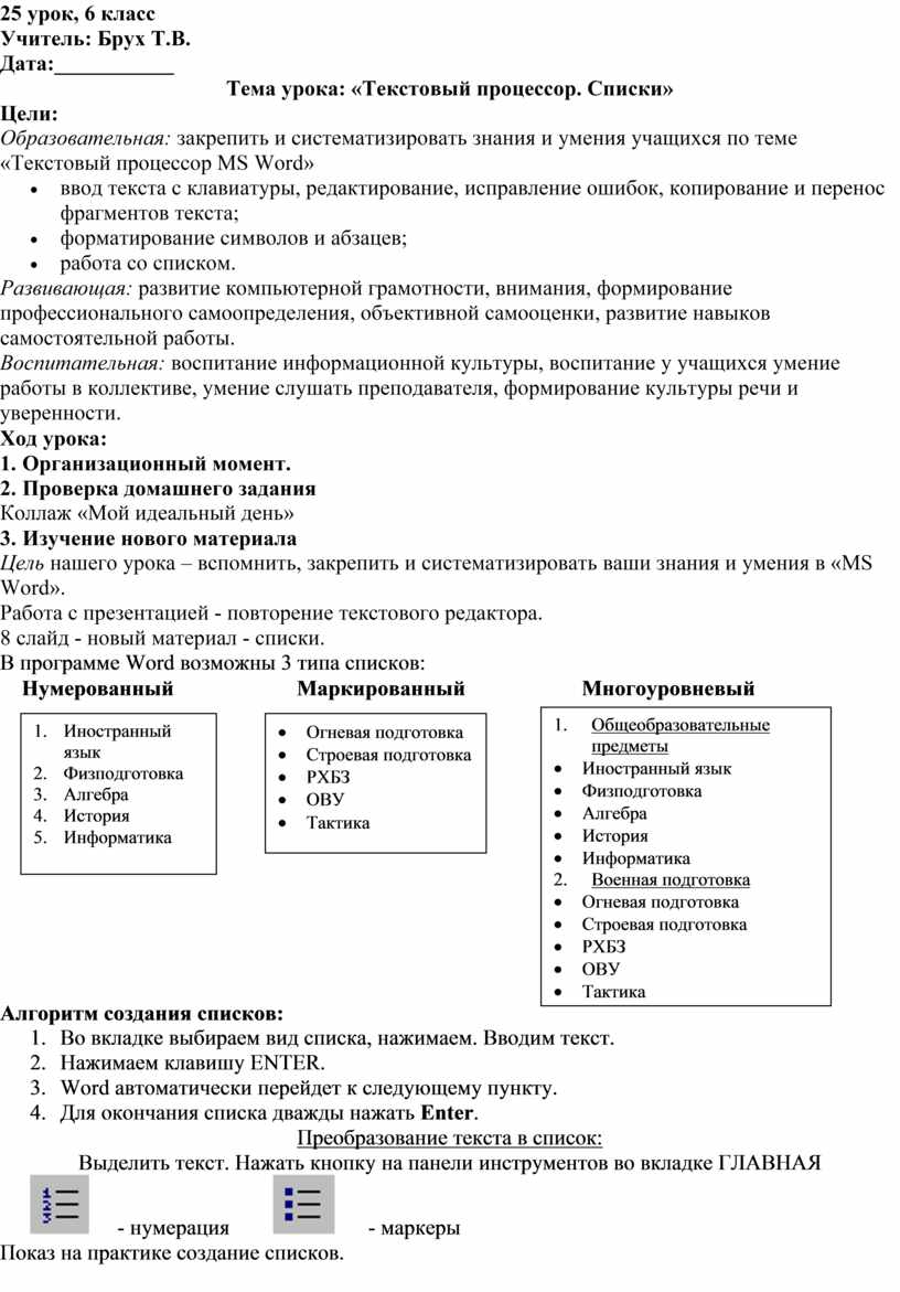 Тема урока: «Текстовый процессор. Списки»