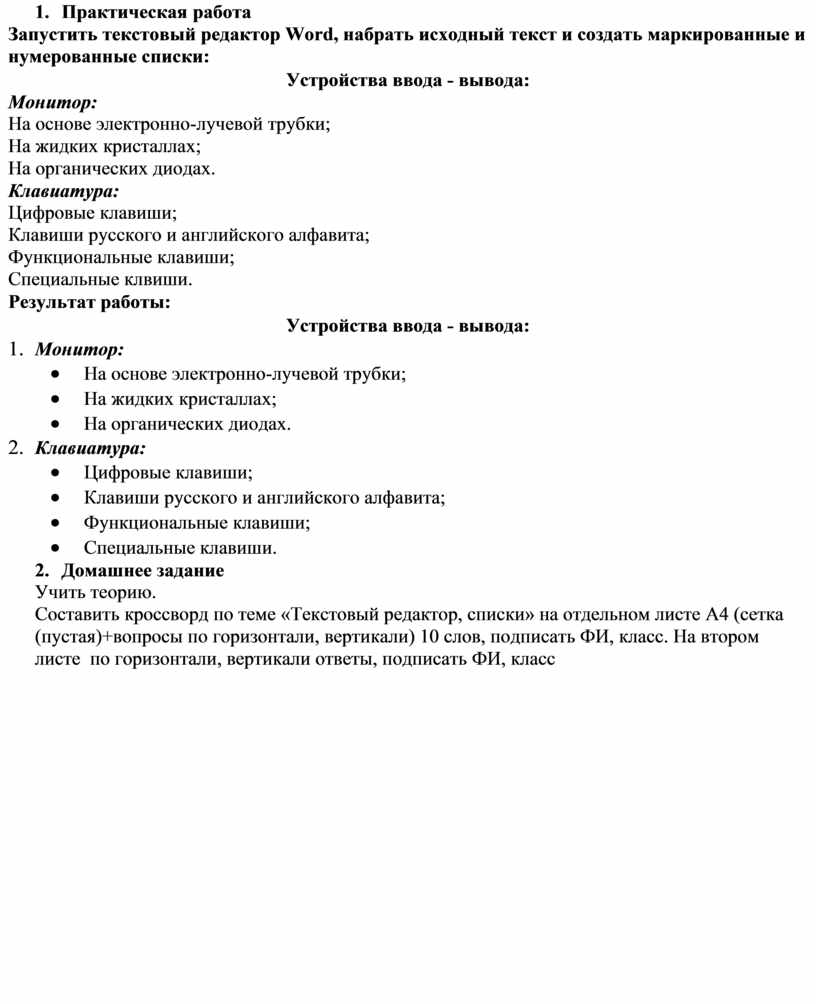 Составить кроссворд по теме «Текстовый редактор, списки» на отдельном листе А4 (сетка (пустая)+вопросы по горизонтали, вертикали) 10 слов, подписать ФИ, класс. На втором листе по горизонтали, вертикали ответы, подписать ФИ, класс