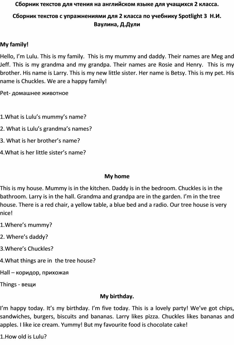 Сборник текстов с упражнениями для 2 класса по учебнику Spotlight 3 Н.И. Ваулина, Д.Дули