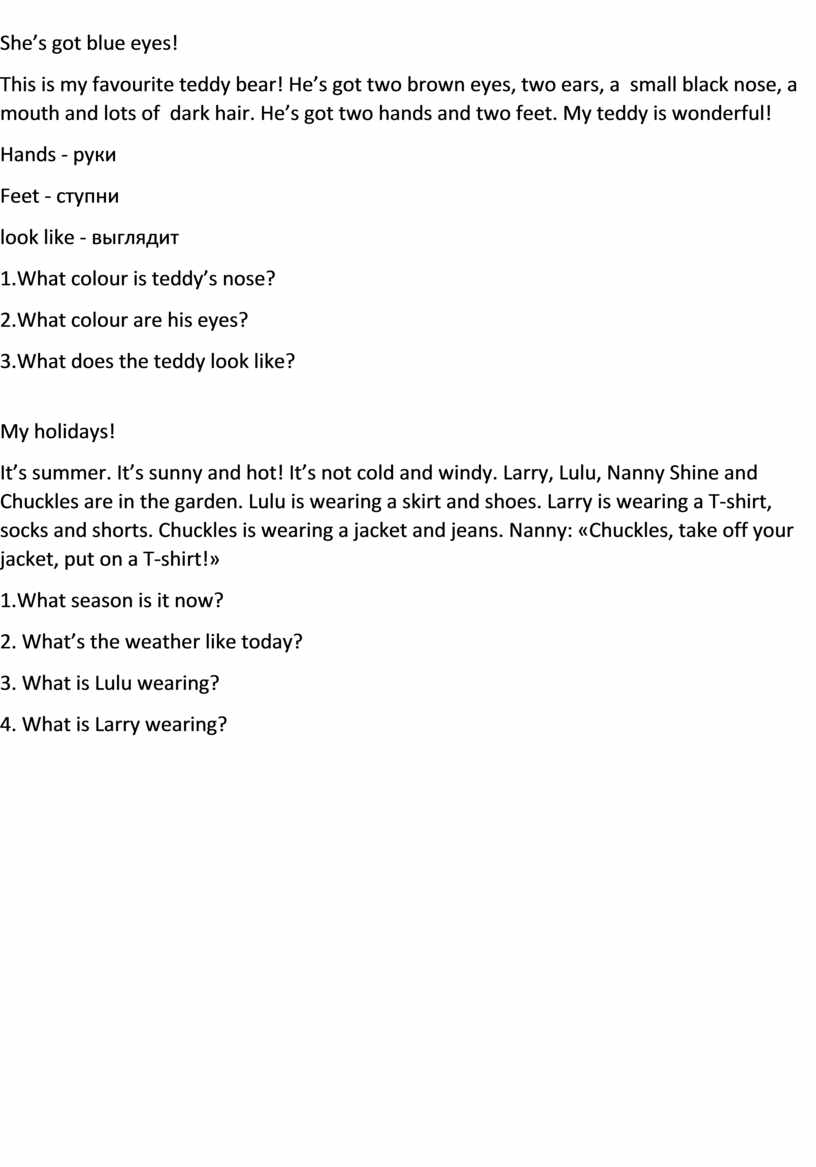 It’s summer. It’s sunny and hot! It’s not cold and windy. Larry, Lulu, Nanny Shine and Chuckles are in the garden. Lulu is wearing a skirt and shoes. Larry is wearing a T-shirt, socks and shorts. Chuckles is wearing a jacket and jeans. Nanny: «Chuckles, take off your jacket, put on a T-shirt!»